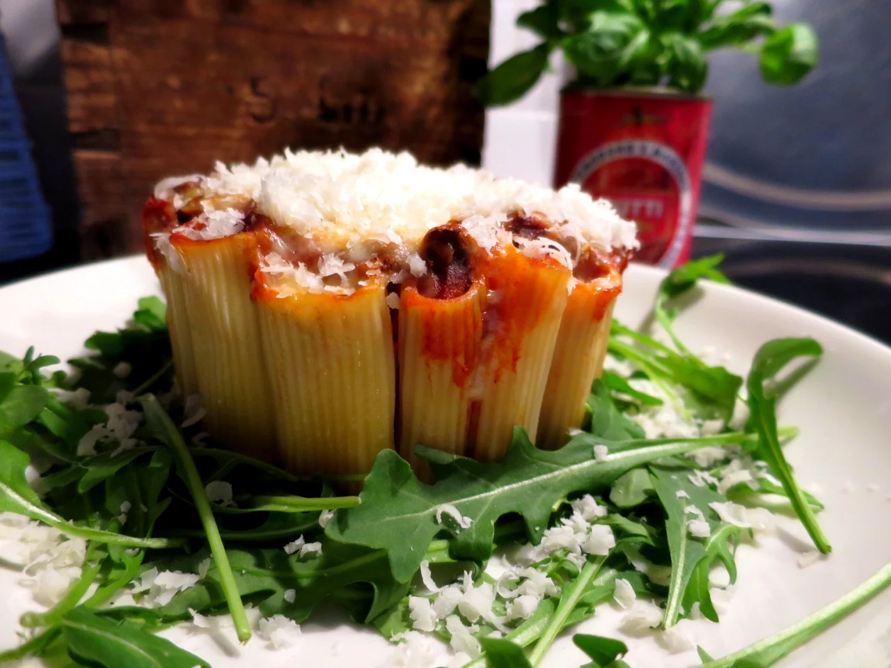 Tomskusoossia putkiin huolella, pienen lusikan avulla se onnistui. Laitoin myös silputtua basilikaa ja juustoraastetta putkiin. Päälle reilusti juustoraastetta ja uuniin. Jos oikein muistan n.20 min / 200 astetta oli riittävä. Sulatin pienessä kattilassa voita ja kun otin renkaan pastan ympäriltä pois, lirutin ulkokuorelle ja lootan päälle voisulaa. Koska voin.