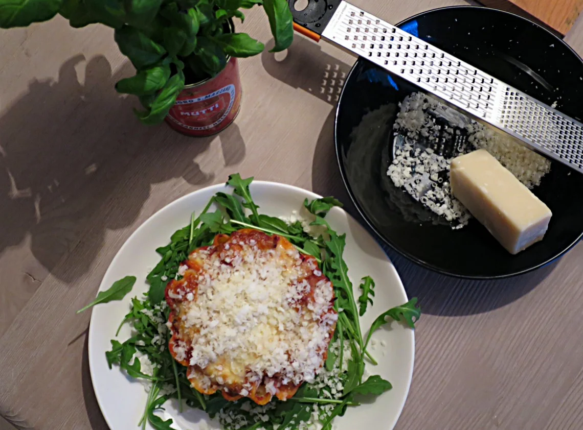 Pasta rakastaa basilikan lisäksi myös rucolaa joten lisukkeeksi reilusti sitä. Parmesaania päälle.