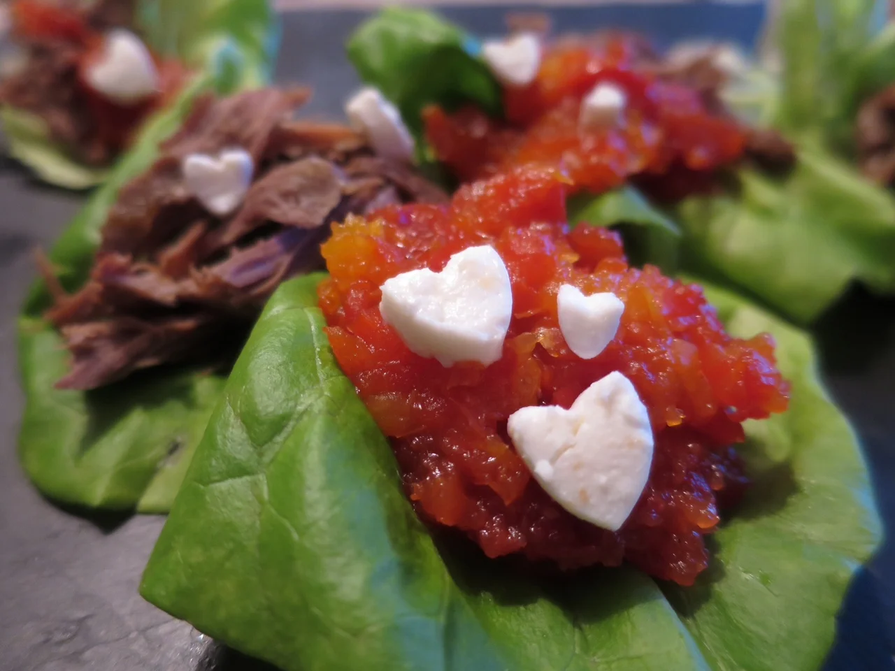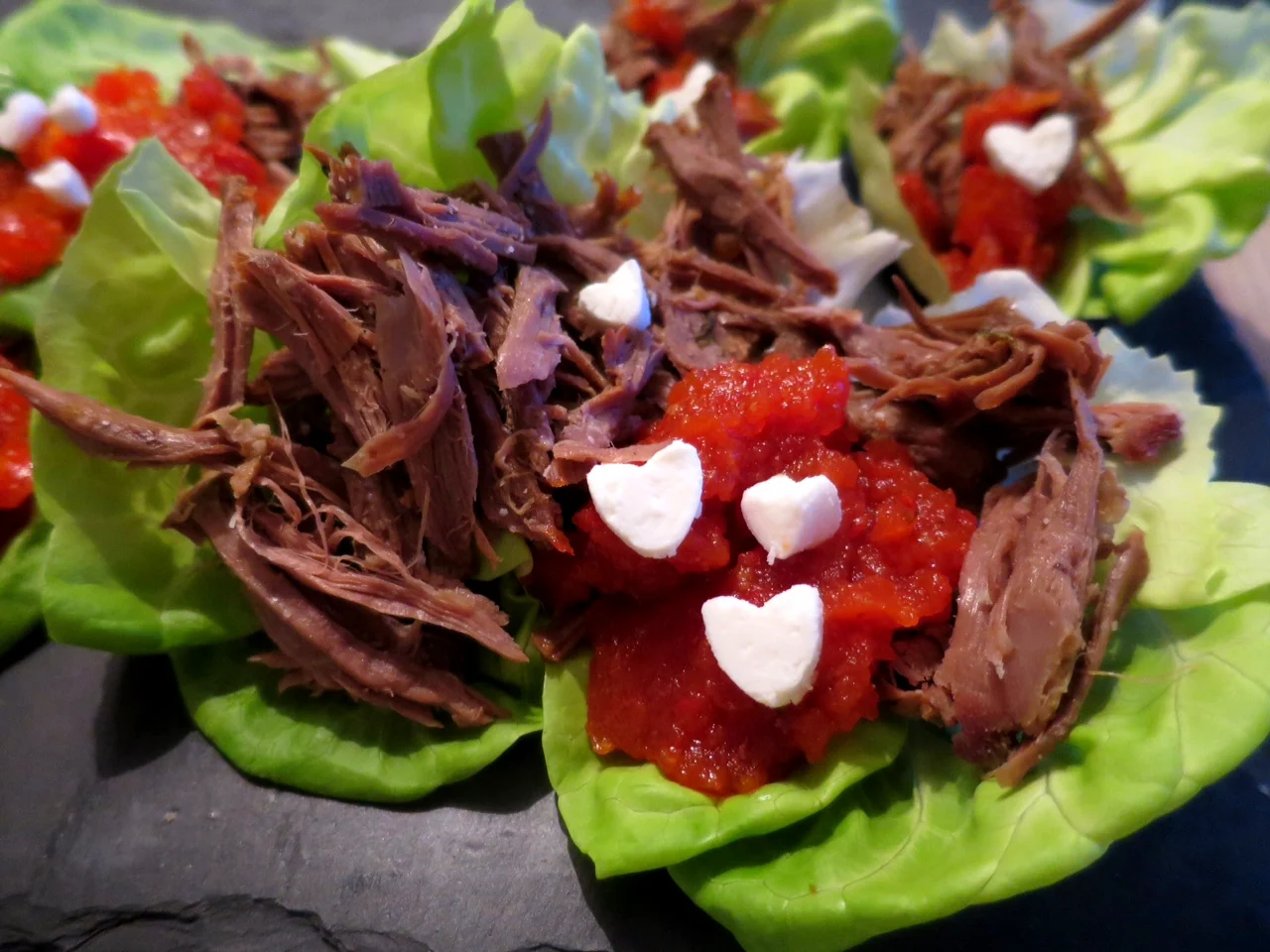 Salaatti on kyllä hauska tyyppi. Sen nimen alle mahtuu monenlaista vihreää lehdykkää tai pallukkaa. Salaattilehdille laitoin karitsaa, paholaisen hilloa ja vuohenjuustosta sydämiä.