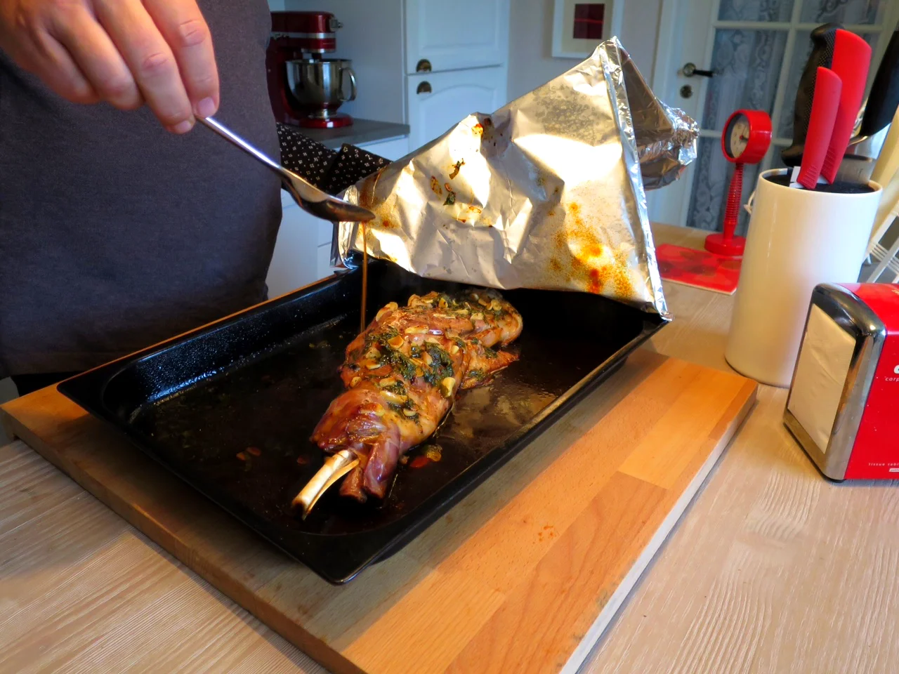 Noin kahden tunnin kohdalla on aika kurkata folion alle ja valella lihaa marinadilla. Väittäisin, että nyt jo tuoksuu aikas ihanalle!