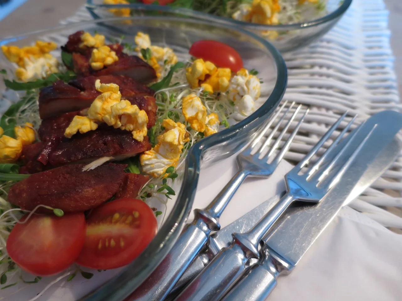 Karkkikanasta riitti kahdeksi ateriaksi. Ekkuna syötiin salaattina poksupopcornien kanssa ja tokkuna matkin Matin kananpoikaa.