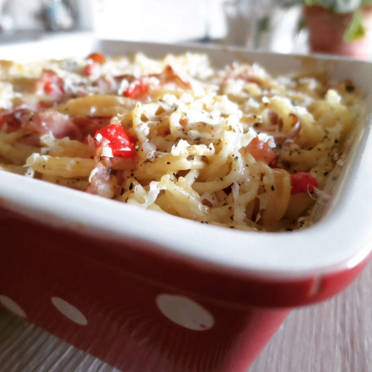 Pastan kypsyyden kanssa on vähän haastavaa. Pastasta tulee ihanan suussasulavaa kun sitä hauduttelee kermakastikkeessa. Muttei se silloin taida olla sitten se haluttu al dente. Olenkin keksinyt ratkaisun tuohon ongelmaan. Pastavuokaahan tässä oltiinkin tekemässä. Hah, vuoan pohjalle kermaa, pastahässäkkä perään ja päälle parmesania raastettuna. Hetkeksi uuniin. Helppoa ja hyvää!
