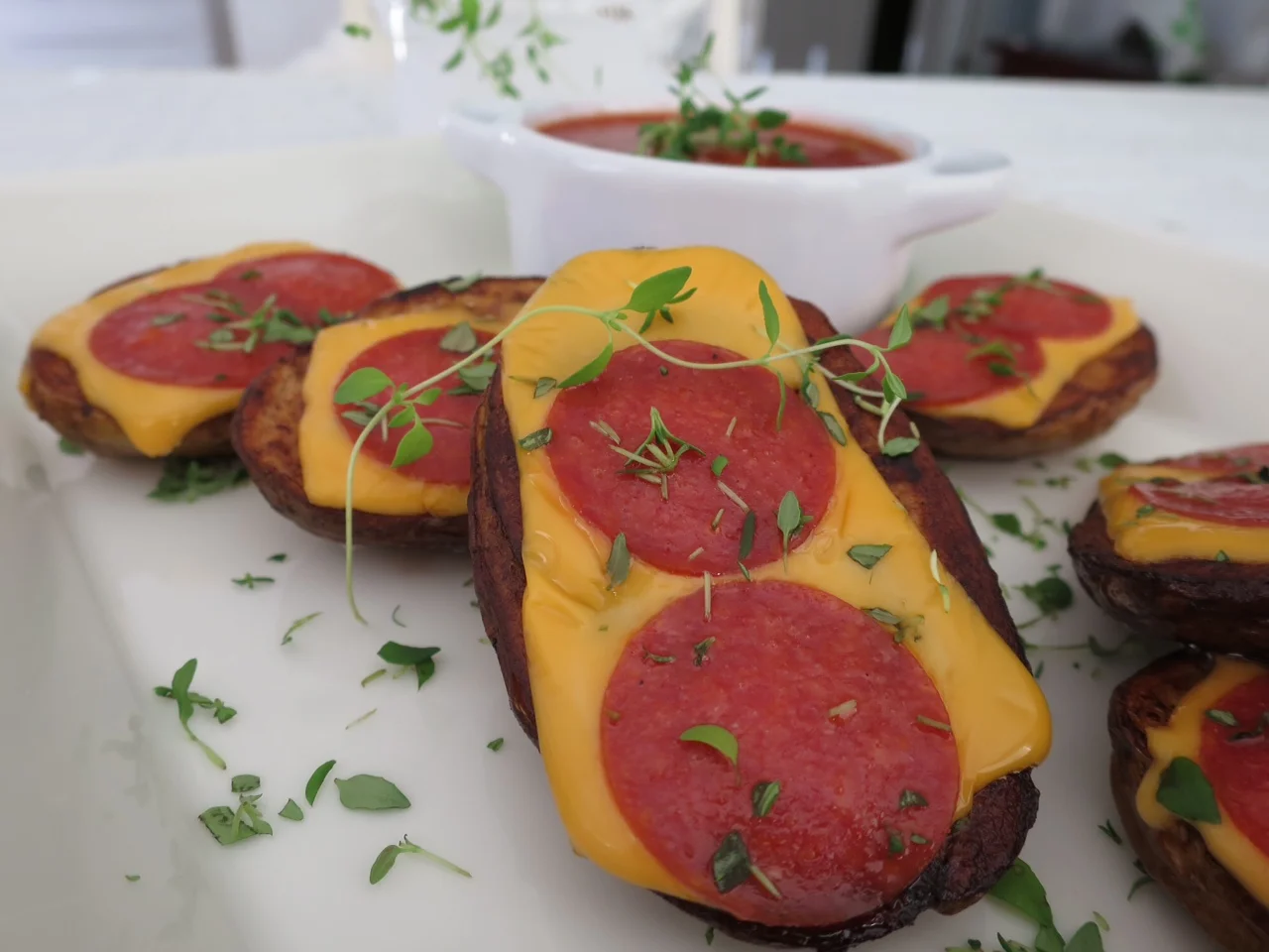 Kokeilin pottusten kypsyyden, ja kun se vakuutti minut, otin ne uunista. Laitoin pottusten päälle cheddaria ja pepperonisiivuja. Takaisin uuniin pottuset laitoin ajaksi jolloin juusto suli. Mausteeksi tuoretta timjamia ja mukaan vielä tomaattikastike. Meillä pottuset syödään sormin tomaattisoossiin dippaillen.