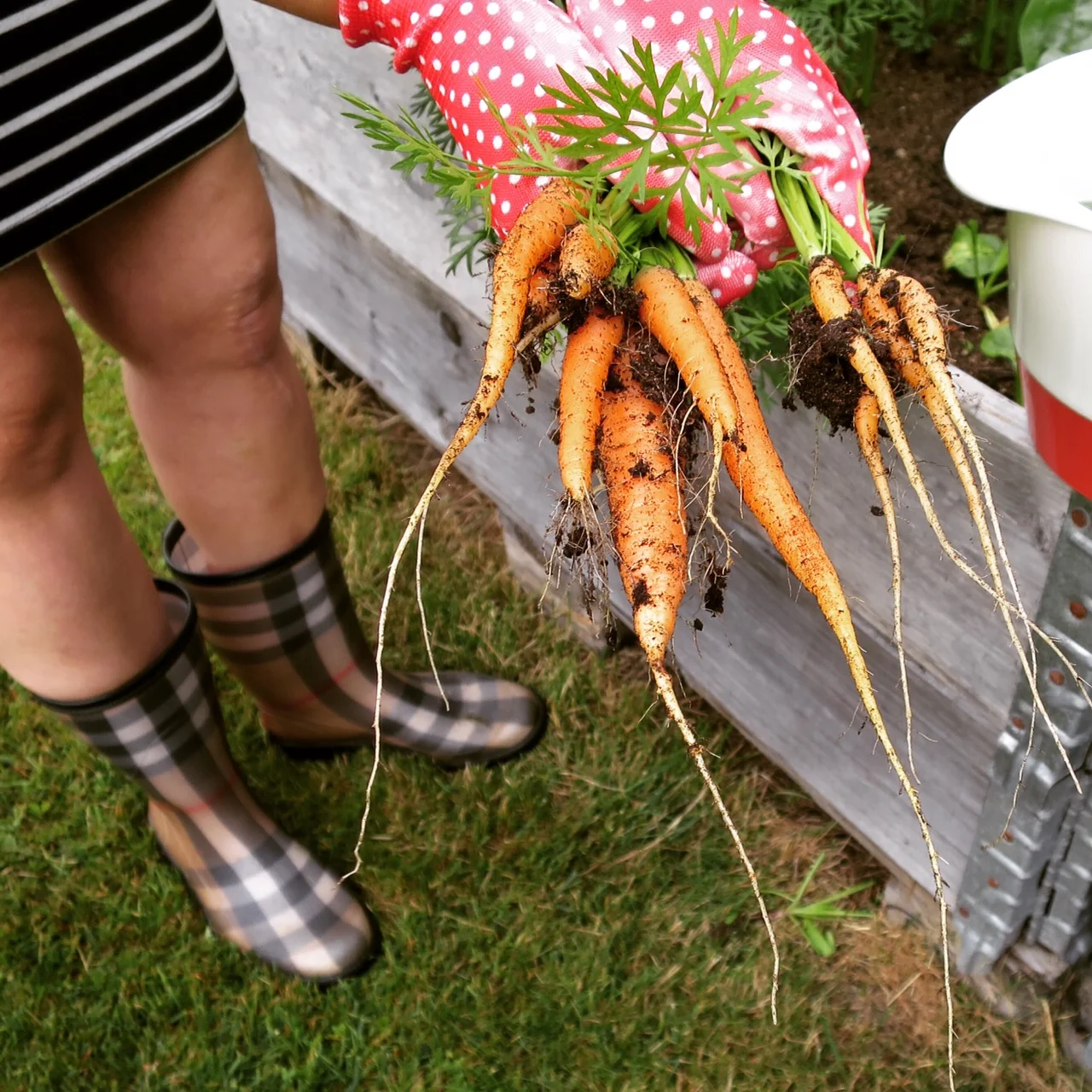 /Kasvimaallani kasvaa porkkanaa ja pinaattia. Muutakin, mutta otsikon mukaisesti pidän ne nyt pääosassa. Kasvimaa on liioittelua, oikea termi ja totuus on kasviloota. Niitä on 4. Kauniita harmaita trukkilavoja ja niissä reunat, vaiko laidat... Sellainen systeemi josta tulee lootalaatikkoinen. Tyyli on tärkeää myös kasvien viljelyssä sekä sadonkorjuuhommeissa, pallohanskat ja kaikki.