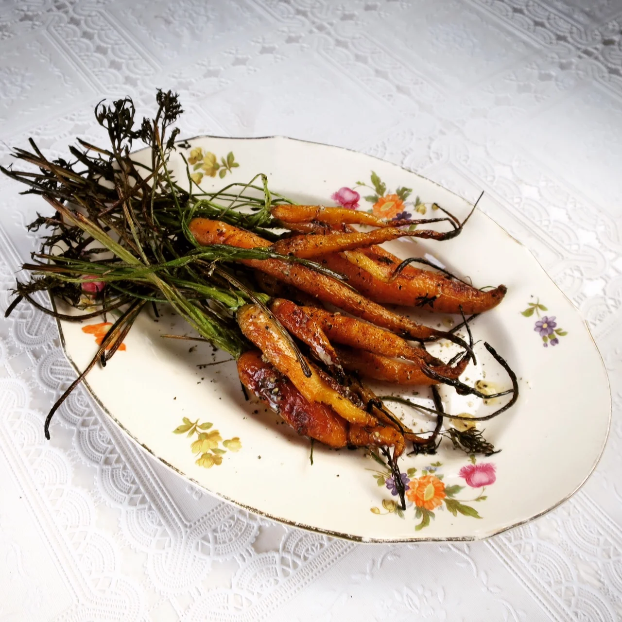 Kesäporkkana ei kaipaa kylkeensä kuin voita. Pestyt porkkanat sivelin voisulalla, jossa ripsuinen suolaa ja mustapippistä. Meillä porkkanat grillataan naatteineen. Asettelin porkkanat mummultani peritylle lautaselle. Tunsin makumuiston lapsuudesta; mummun porkkanasämpylät, niin lämpiminä, että voi suli siihen. Lasi kylmää maitoa.