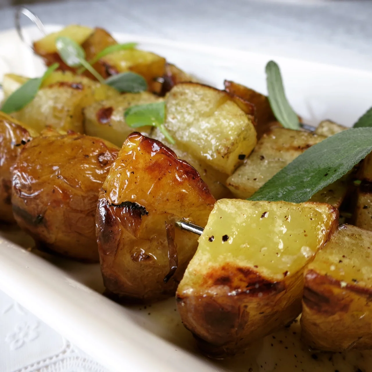 Grungepotuista sen verran, että olen nimen lanseerauksen takana. Käytän mielelläni sanaa grunge tilanteissa, joissa ei olla niin justiinsa ja viivottimen kanssa. Keittiöelämä meillä perustuu tähän touhotukseen. Vaihtoehtoinen ja luova tapa toimia. Sitä on grunge. Minun verbaalimaailmassani. Potut siis pilkotaan miten tykkäät, sivellään voisulalla ja grillataan vartaissa. Salvia toimi seremoniamestarina grungepottusille. Ja hyvin hoitikin hommansa.