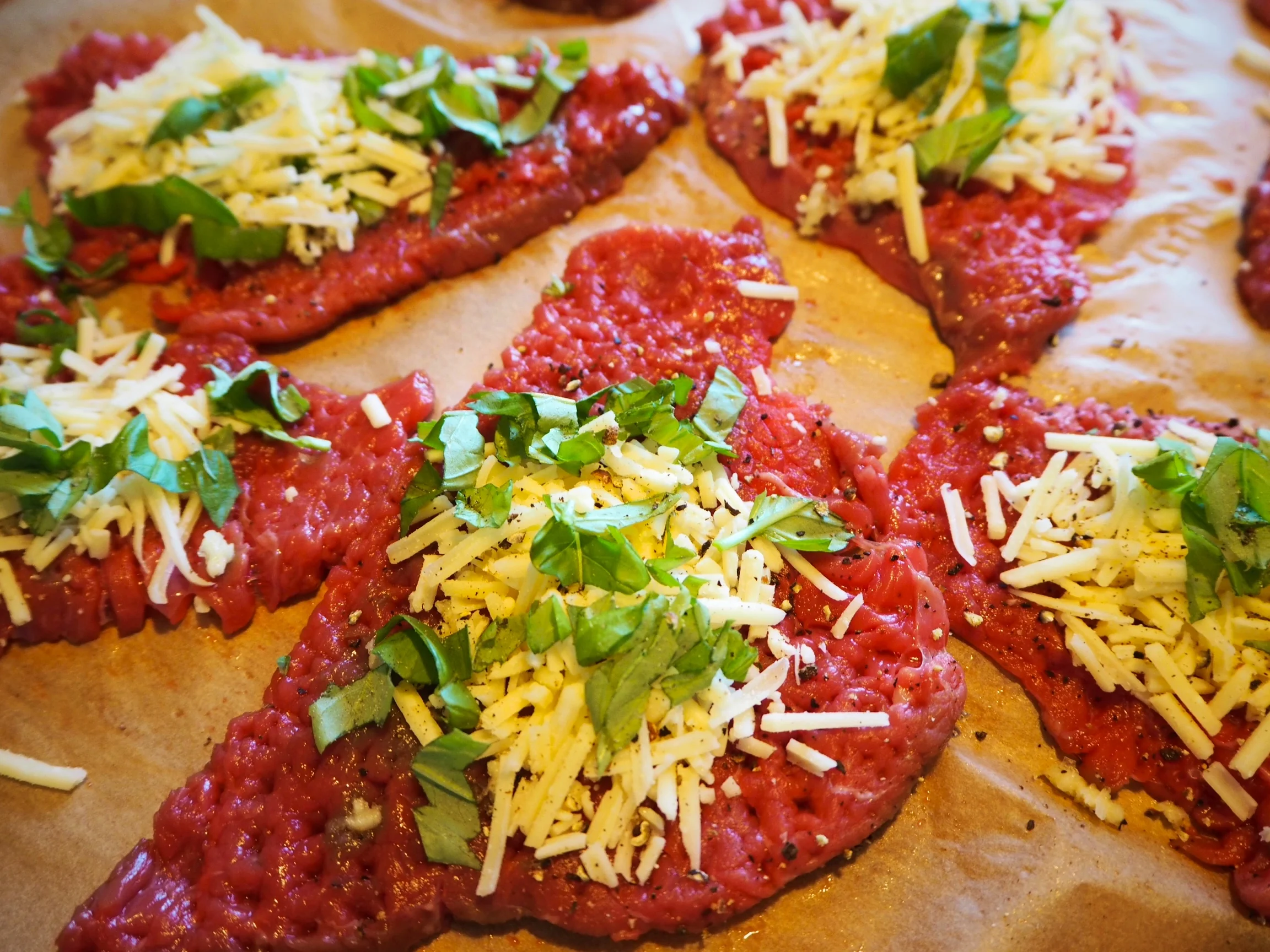 Raasta jokaisen pihvin päälle reilu kasa parmesaania. Leikkaa tai saksi myös tuoretta basilikaa ja purista valkosipulia maun mukaan.