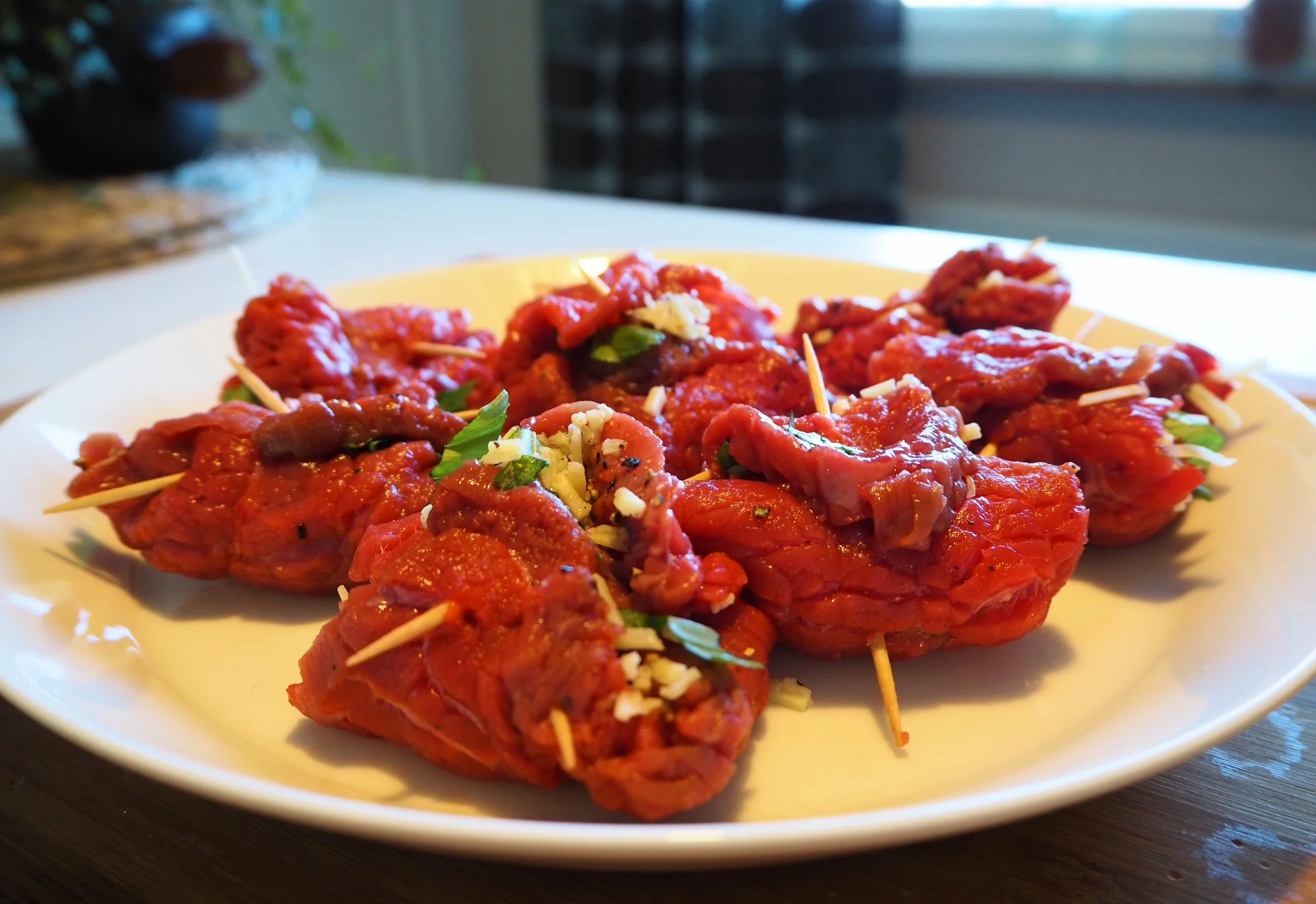 Tee pihveistä rullia tai myttynyyttejä. Koita saada tiukka paketti, jotta täytteet pysyvät sisällä. Kiinnitä hammastikulla tai kahdella mytyt.