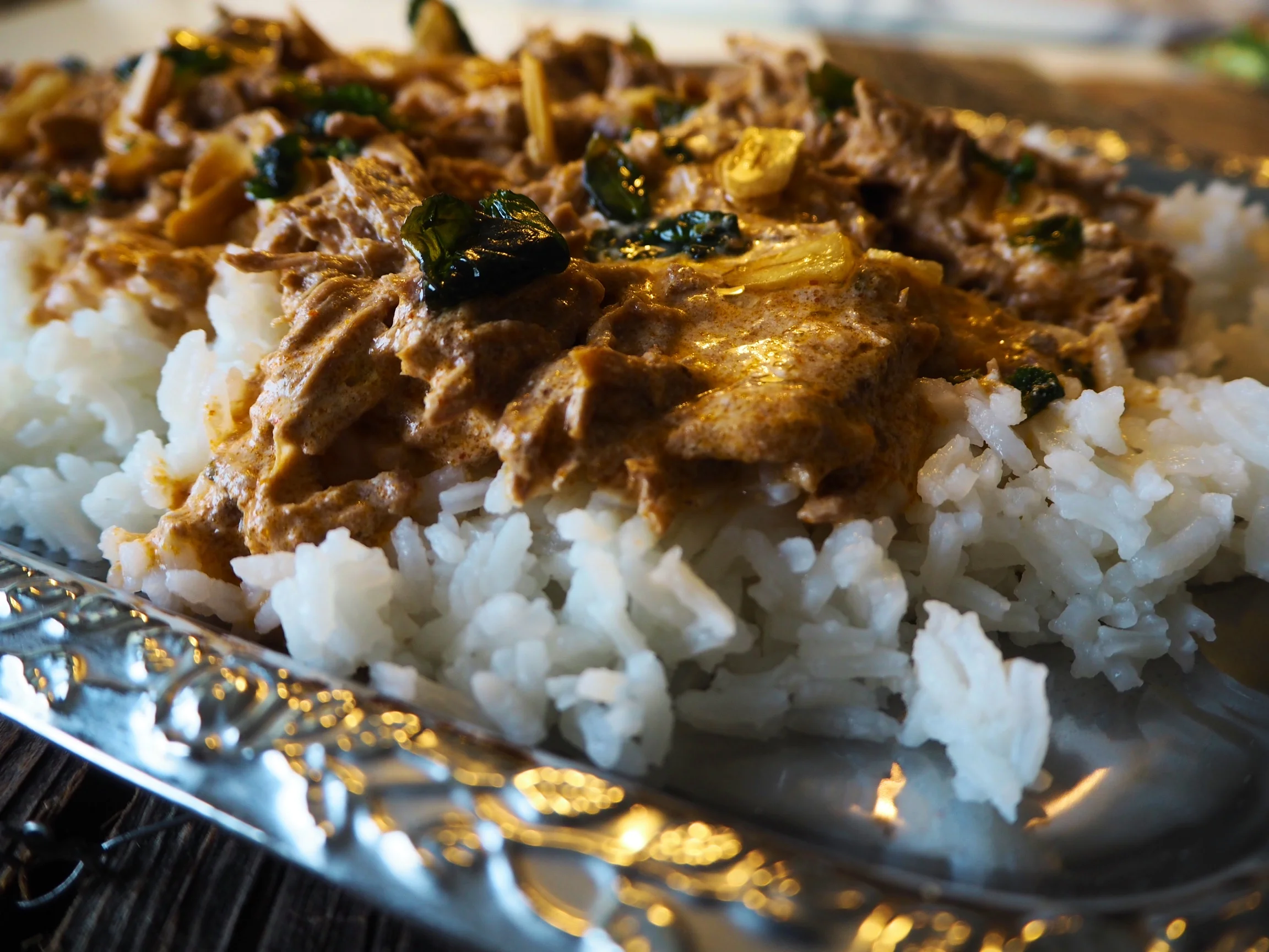 Curryn voi tehdä possusta, kanasta tai lampaasta. Meillä oli lampaanlapaa pakkasessa. Sen sulatin ja uunissa paistoin. Lihat "nyhdin" ja laitoin ne pataan. Padan pohjalle tilkkanen öljyä ja valkosipulia maun mukaan. Lisäsin pataan muutaman ruokalusikallisen valmista currytahnaa. Sekä tilkkasen vettä. Annoin kuumentua, lämmetä. Muhittelin currya puolentunnin ajan hellan hellällä höökillä. Tarkistelin välillä ettei nestettä ole liian vähän. Sitten vielä lisäsin curryyni n.1 dl:n maustamatonta jogurttia.