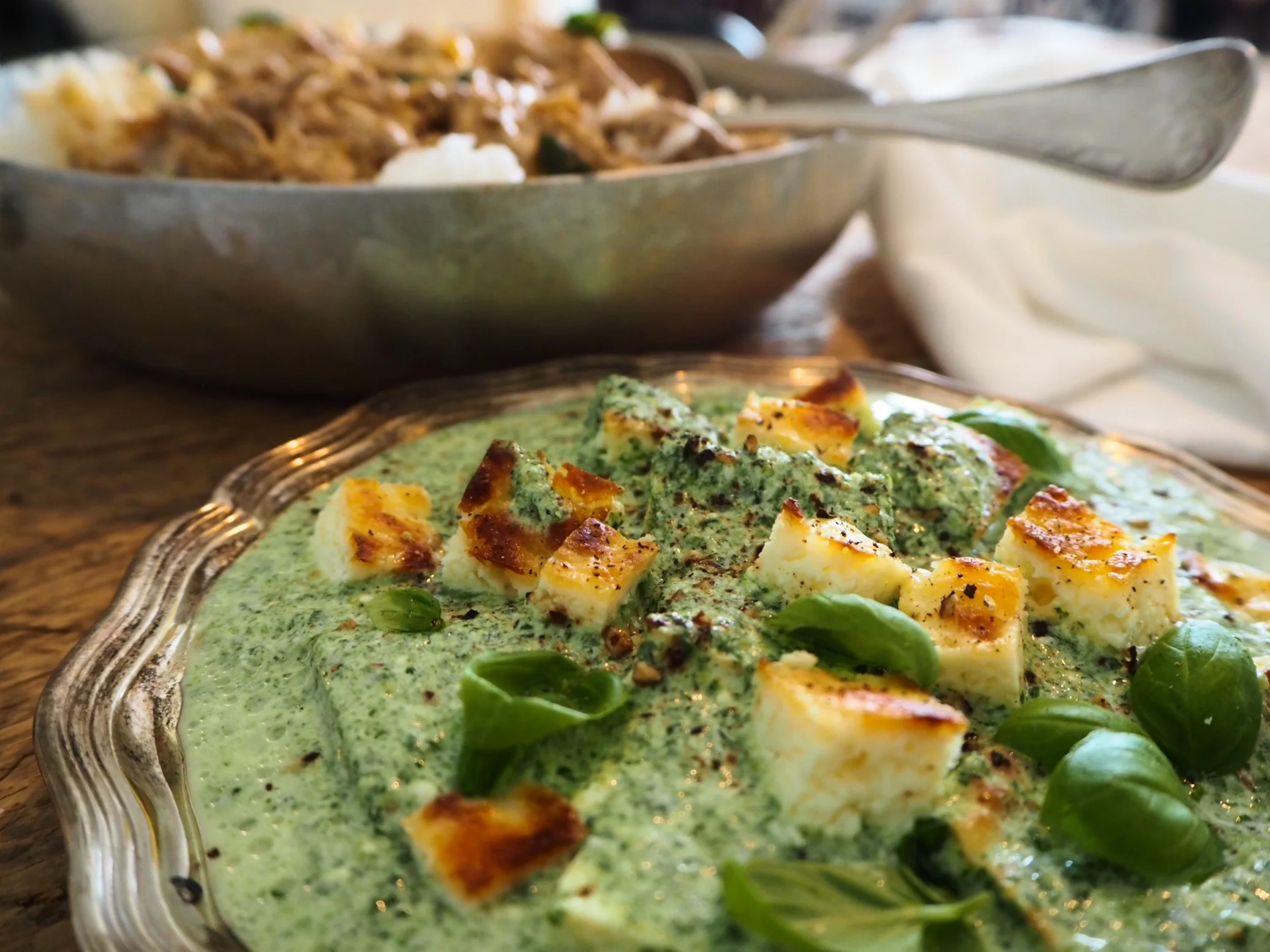 Kuullota pannulla pienitty valkosipuli öljyssä. Mausta currylla. Lisää pannulle jäinen pinaatti, kuumenna. Sekoittele.