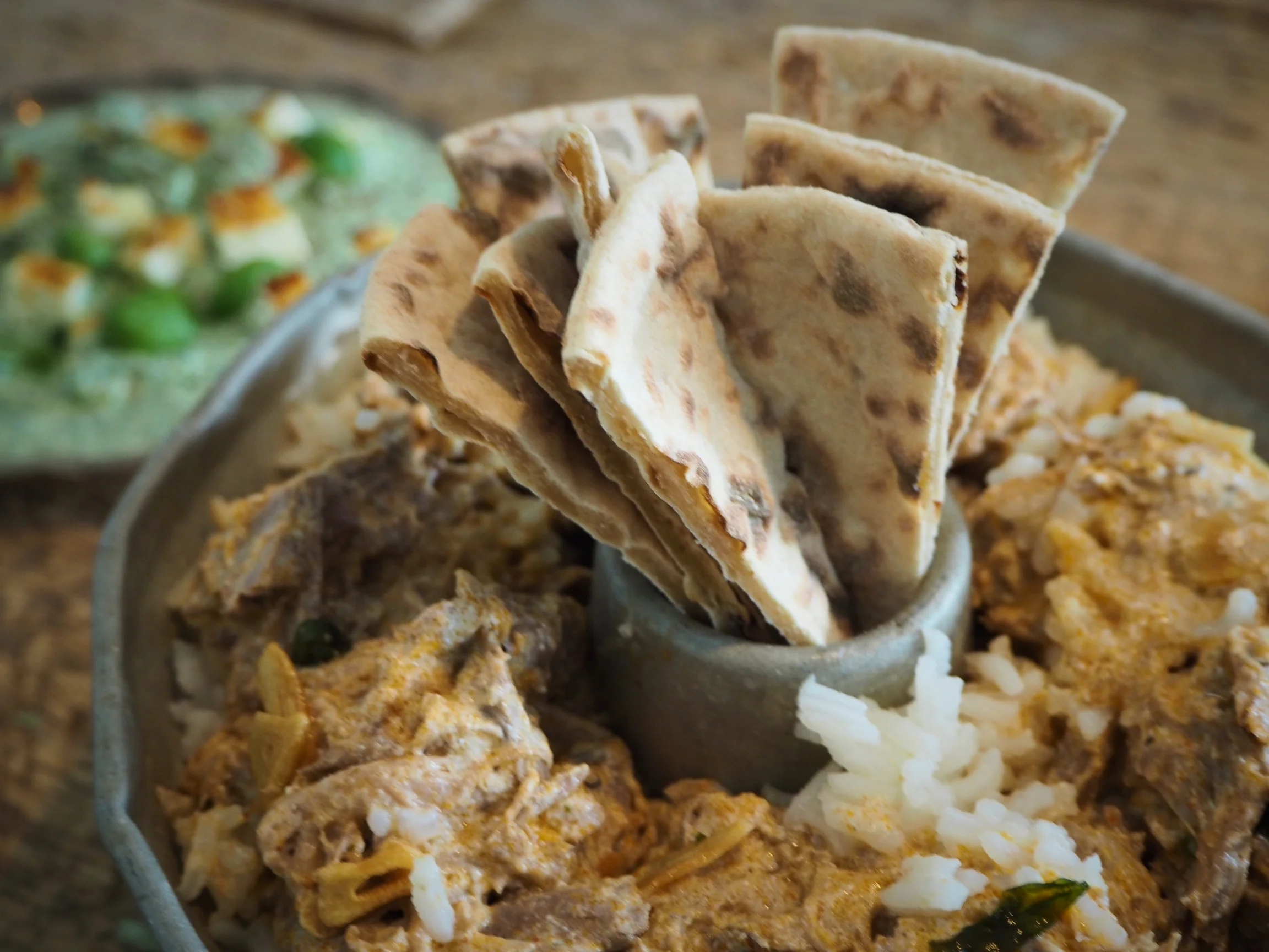 Curry on ruokana mitä mainioin. Meillä oli tosiaan iso lampaanlapa, siitä piisasi syötävää muutamaksikin päiväksi. Curry on siitäkin ihana ruoka, kun se paranee vaan vanhetessaan. Saa maut oikein currytahnasta irtoilla. Olen tykästynyt kaupasta saataviin valmistahnoihin. Vaikka tahnaihmisenä tykkään niitä itsekin touhuilla. Tässä kohden katsoin kuitenkin että leipäjuuston tekeminen oli se juttu, tahnassa saan oikaista. Sama oli naan-leivän kanssa. Meinailin ensin vähän itse paistella. Kauppaan kuitenkin kävelin. Meillä ei ollut kylämme kaupassa naan-leipuskaa. Ostin rieskaa. Herra Ässä sanoi että se toimi kivasti. Itsetehtyä leipäjuustoa ja rieskaa intialaisin maustein Rouva Ässän tapaan.