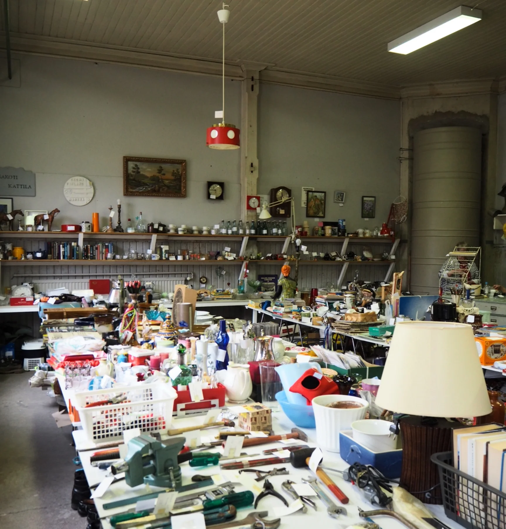 Jos olisin sisustussuunnittelija tai minulla olisi tarve löytää paljon kivaa tavaraa; pöräyttelisin pakupakettiautoisella tälle kirpparille ostoksille.