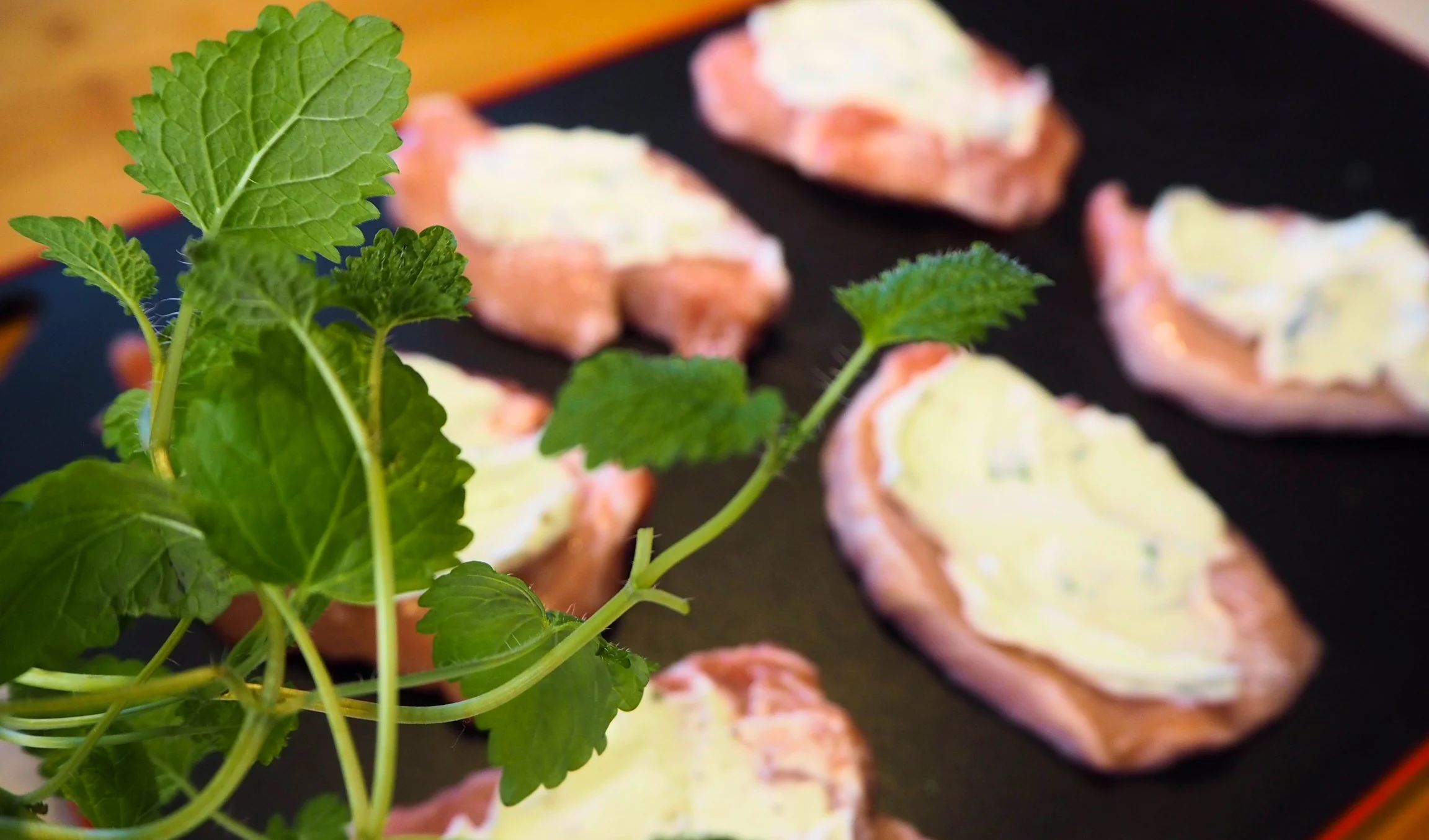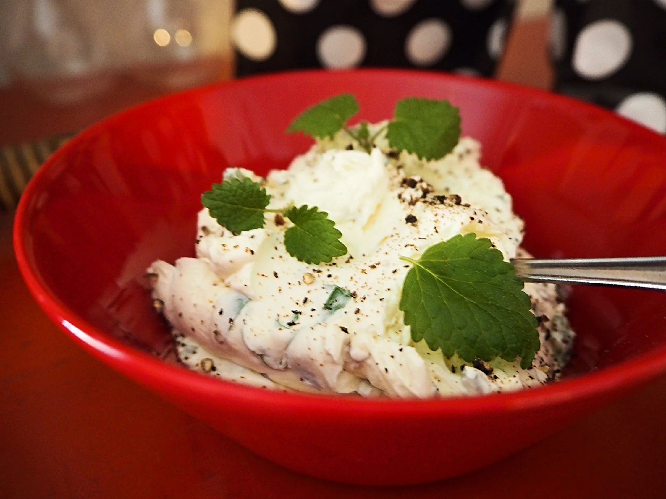 Notkista tuorejuusto tilkalla kermaa. Riivi tuorejuuston joukkoon sitruunamelisssaa, rouhaise mustapippistäkin.