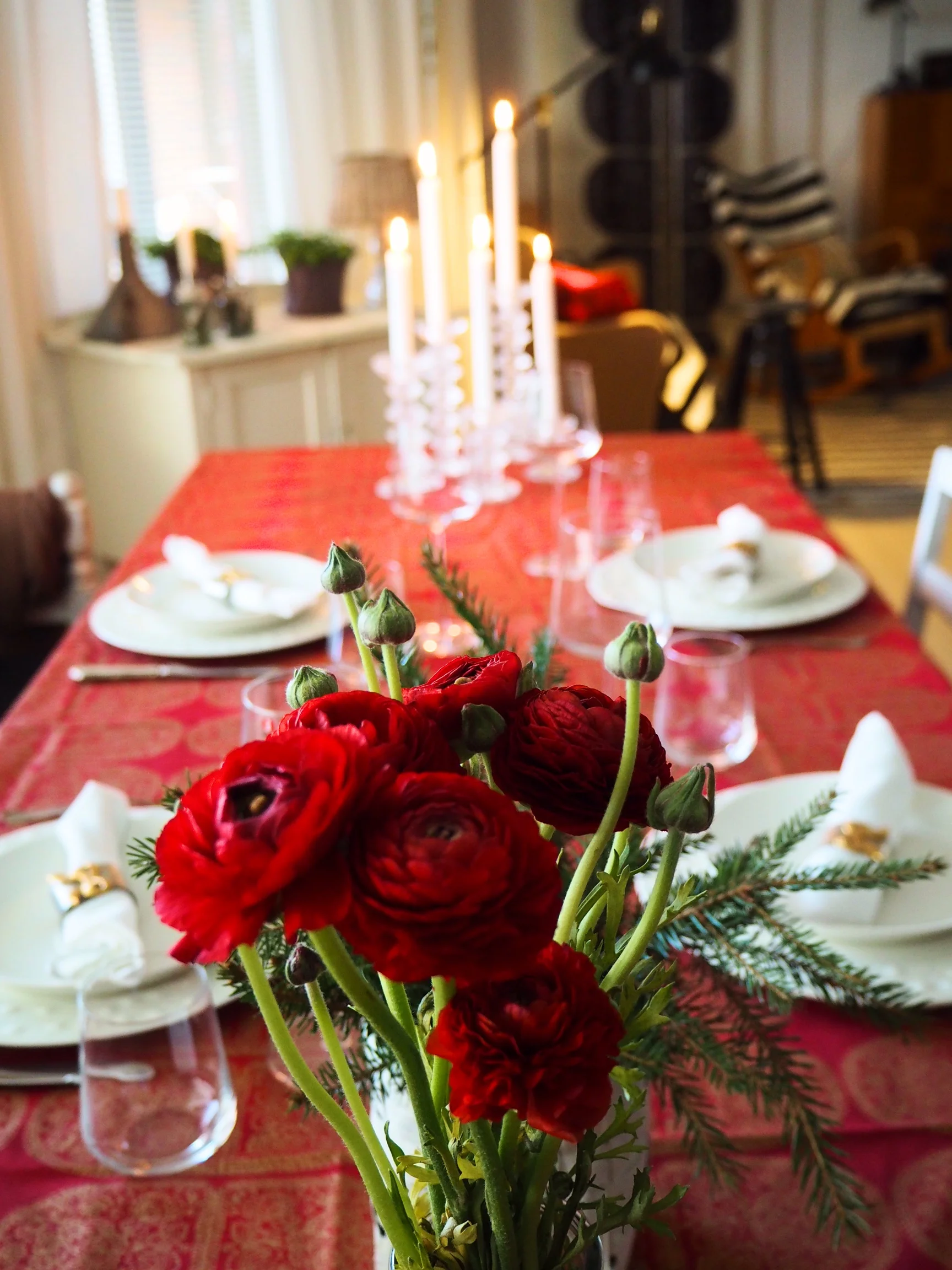 Katoin pöydän kauniiksi. Se on tärkeää. Tuoreita kukkia meillä on lähes aina. Nämä niin mahtavat jaloleinikit ostin Helsingistä, siitä läheltä tukikohtaamme. Kulmilla on kaksikin ihanaa kukkakauppaa, ja kolmas nurkan takana. Arvaatte varmaan että ostelen kukkeja, usein!