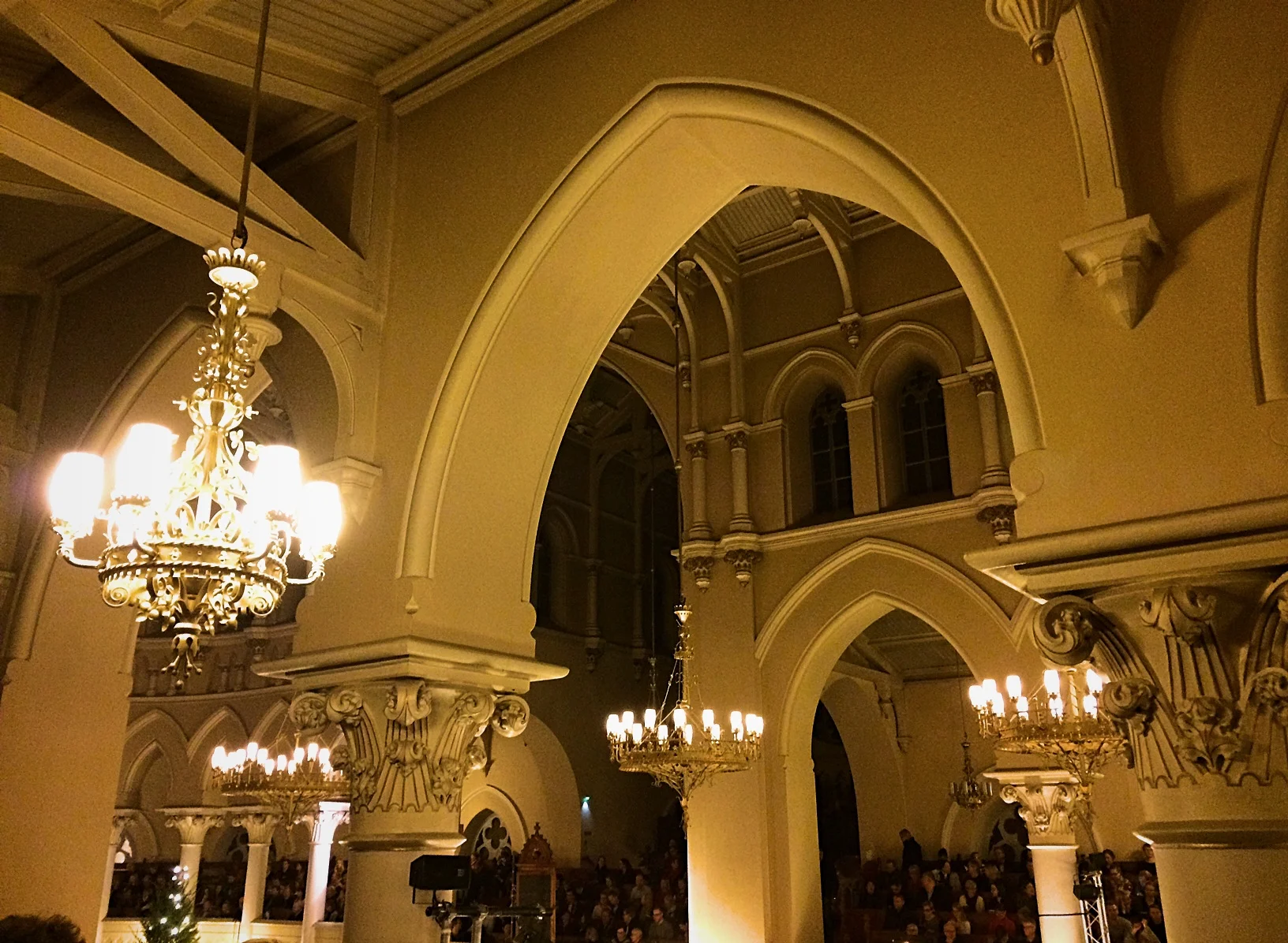 Viime viikonloppu vietettiinkin Helsingissä. Olimme Ylioppilaskunnan laulajien joulukonsertissa Johanneksen kirkossa. Kyllä vaan. Hieno oli. Hauskakin. Vaikuttavakin. Onnistunut oli konsertti. Nappasin kännykällä kuvan kirkon parvella.