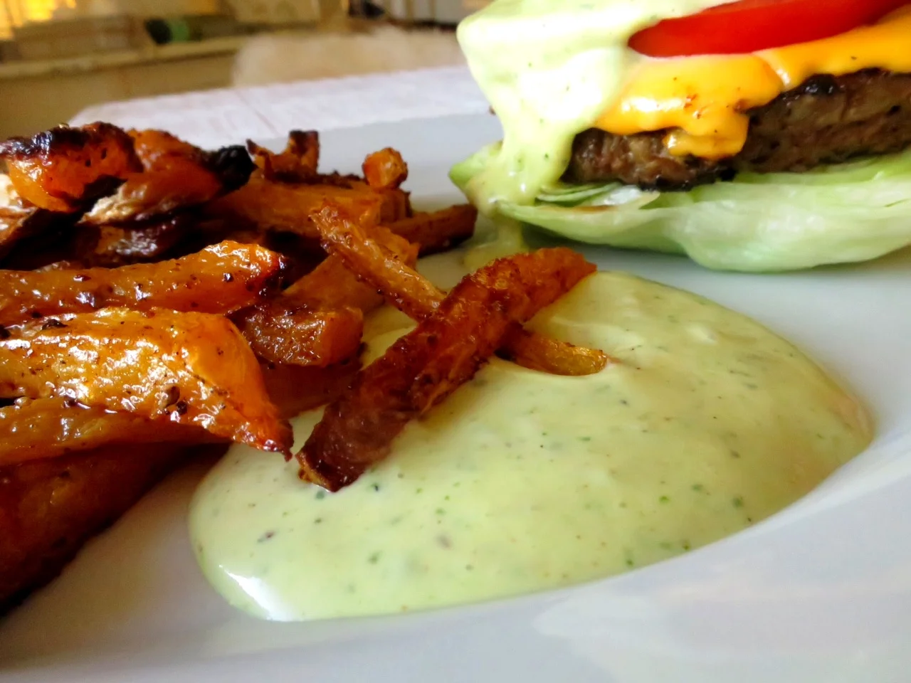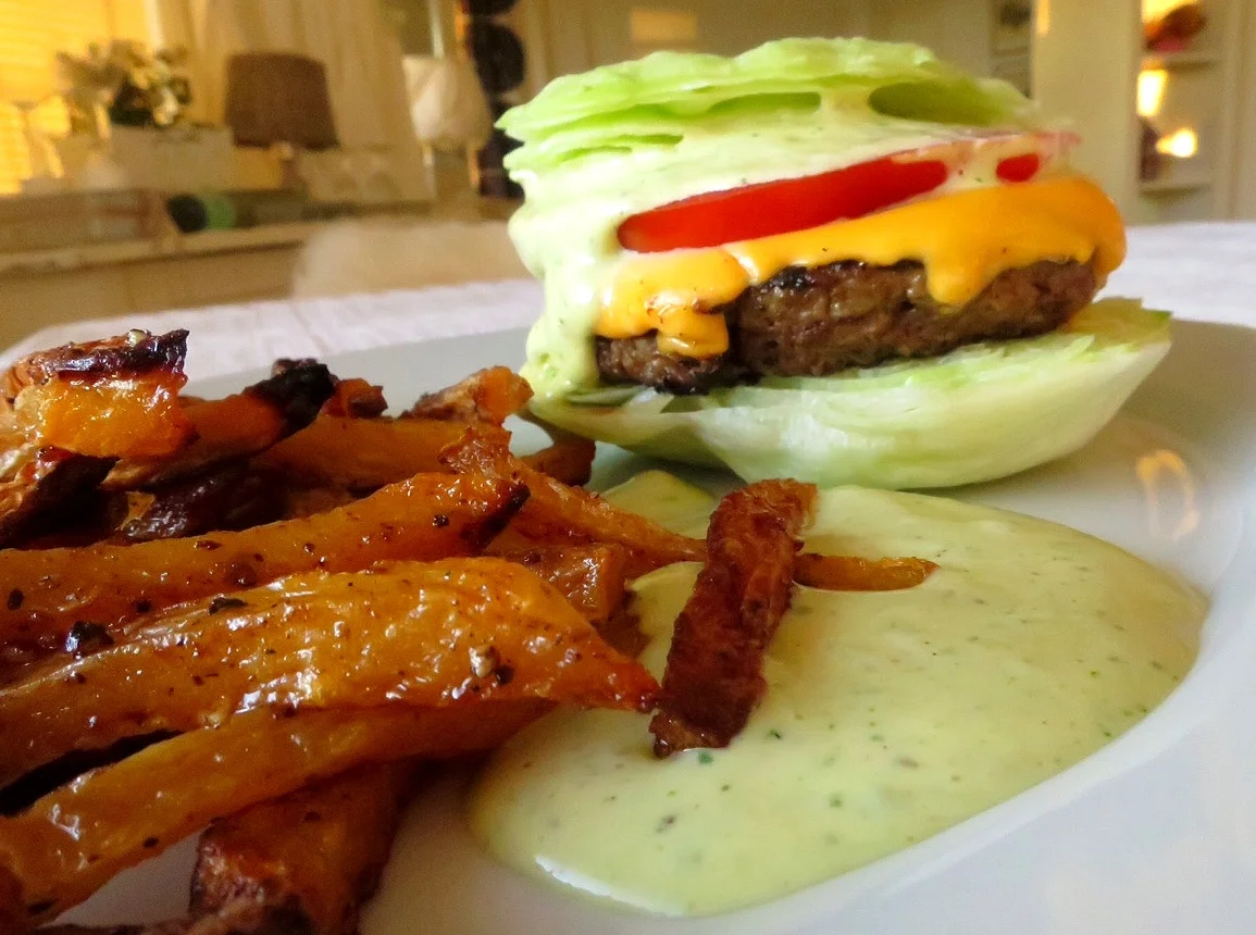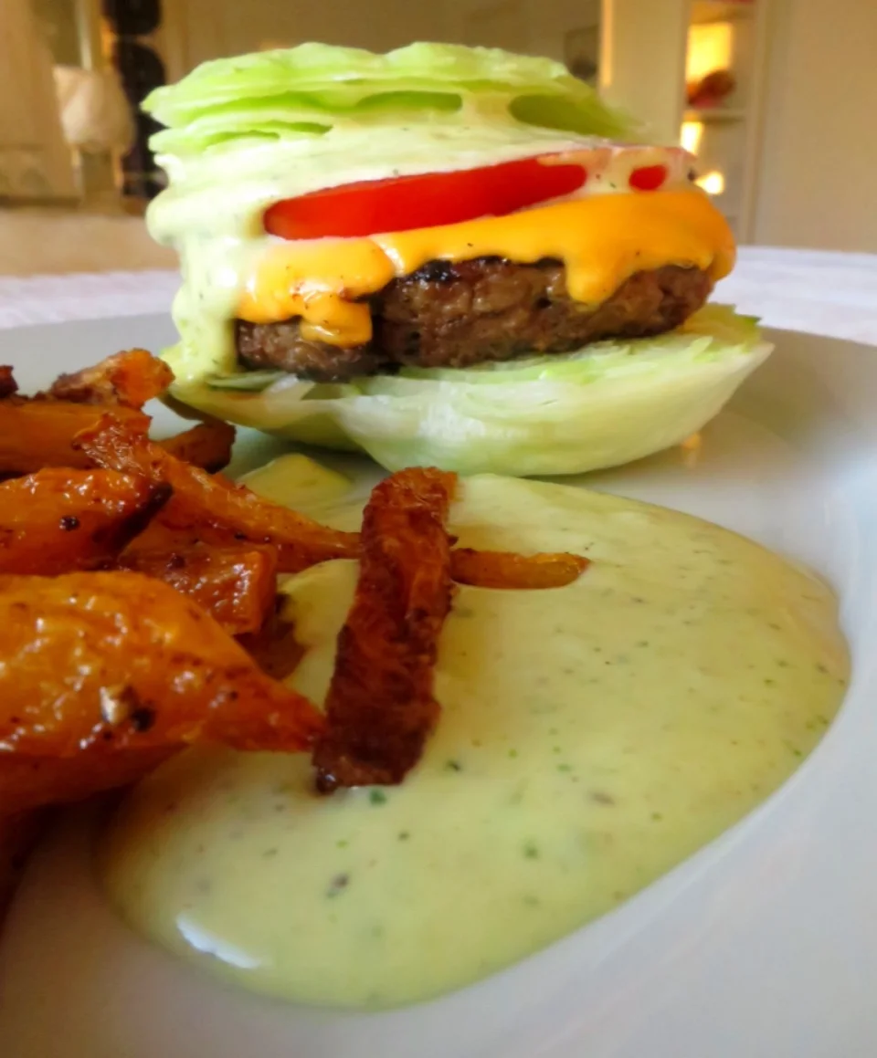 Kaupan heviosastolla sain idean erilaiseen hampurilaiseen. Sitten taas lähti. Siitä. Se ajatus. Leikkiä ja pitää hauskaa köökkisessä. Leikkasin jäävuorisalaatista hampurilaiseeni hatun ja pohjan. Ei ole höttöhiilareita! Kokonaisuus oli raikas. Kevyeksi sinänsä tohdi en sanoa. Tahna ja juusto takaavat kalorit kyllä. Vältinpä vehnän. Herra Ässä tykkäsi niin mausta kuin muotokielestä. Mielellään makusteli kielellään ja söi hyvällä halulla! Ja minä taas hehkuin! Kehuista!