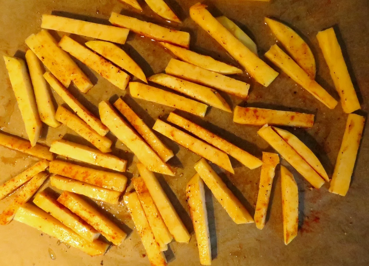 Hampurilaiselleni ja kastikkeelleni tein vielä völiin lantturanskalaiset. Mallittelin ranskanperunoisia. Laitoin uunipellille öljyn, suolan ja paprikajauheen kanssa. Uuniin/ 200 astetta ja aikaa meni n.10-15 minuuttia. Kannattaa koklaa kypsyys.