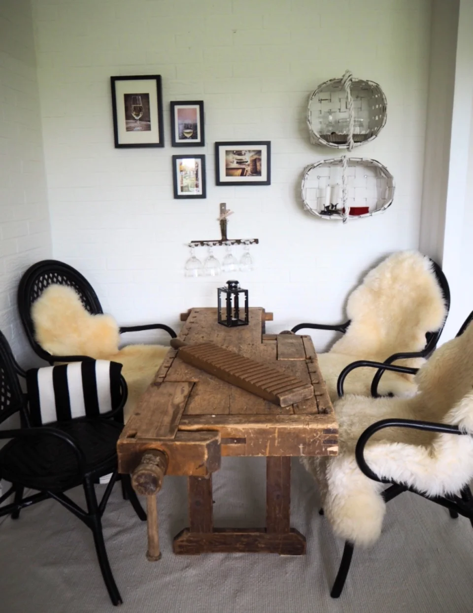 Pidimme viime viikonloppuna Tatun baarin avajaiset. Baarin pöytä on Herra Ässän papan vanha höyläpenkki. Baari on nimetty hänen mukaansa. Seinältä voi ihailla ottamiamme kuvia, maailmalta. Mummuni vanha harava muuttui viinilasitelineeksi ja pärekopsut ovat nyt hyllyinä. Niillä säilytetään mm.sherry- ja viskilaseja.