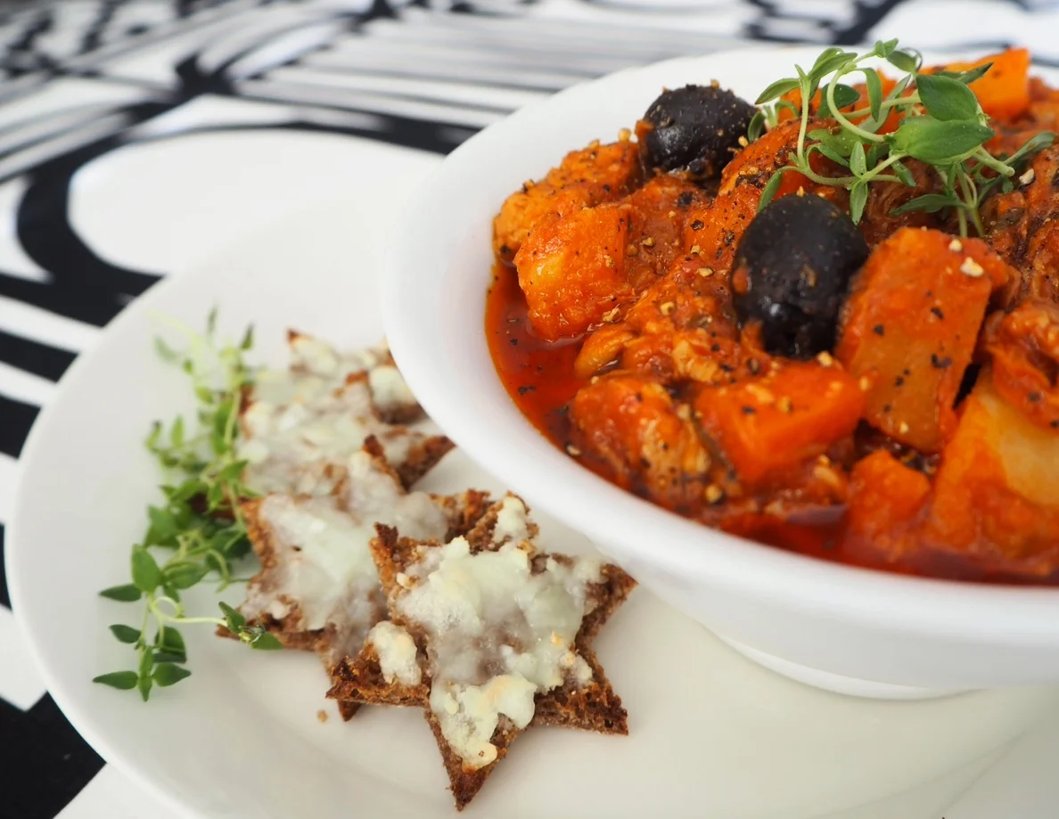 Lisää oliivit ja timjamia. Halutessasi nokare voimakasta juustoa. Meillä laitettiin vuohenjuustoa.