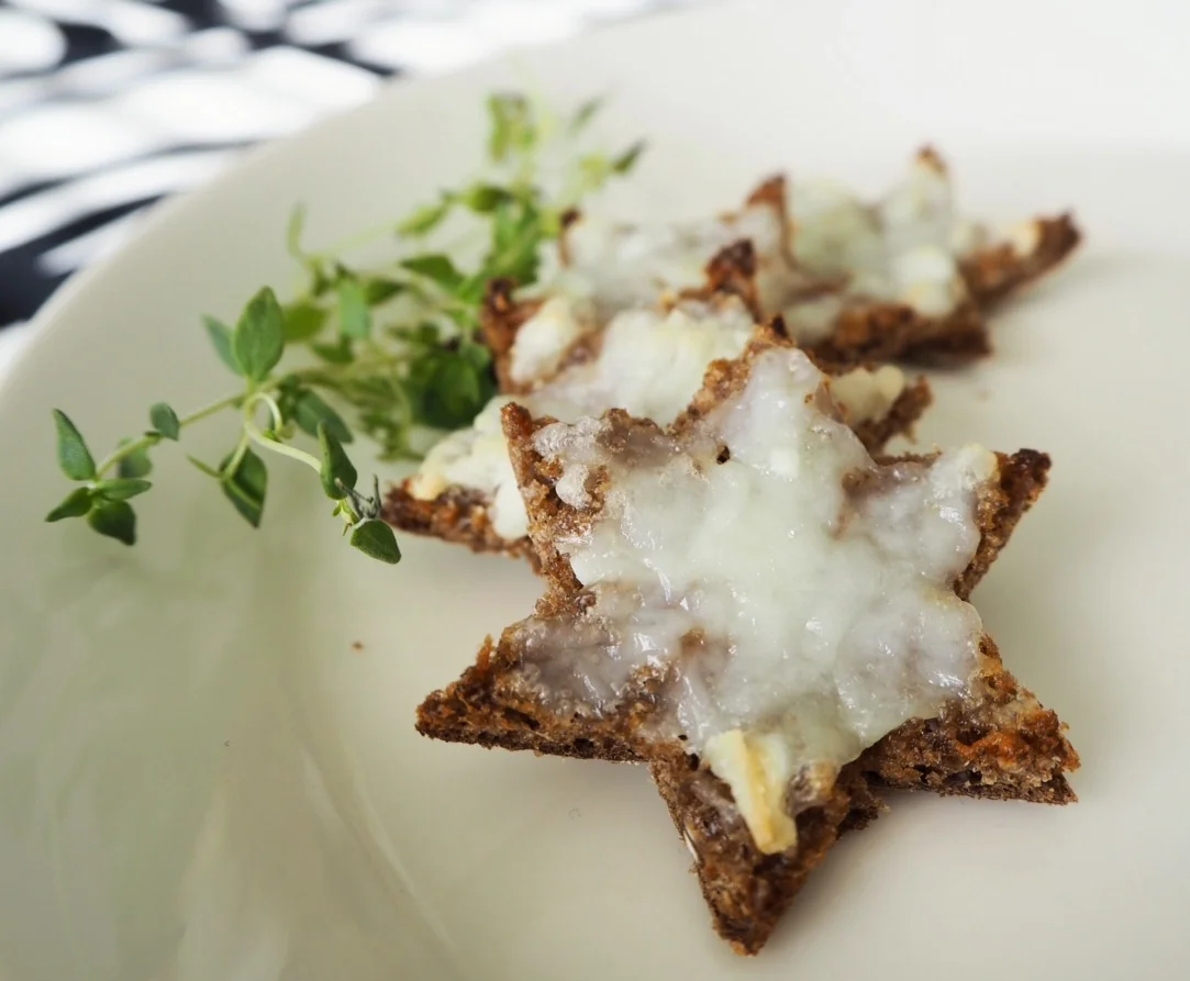Vuohenjuustotähteet käytin seuraavana päivänä ruistähtiini. Sulatin ähteiksi jääneitä ruisleipejä pakastimesta. Tähtiä tein piparimuotilla ruisleivästä. Päälle vuohista. Hetkeksi uuniin. Tähdellistä leipää.