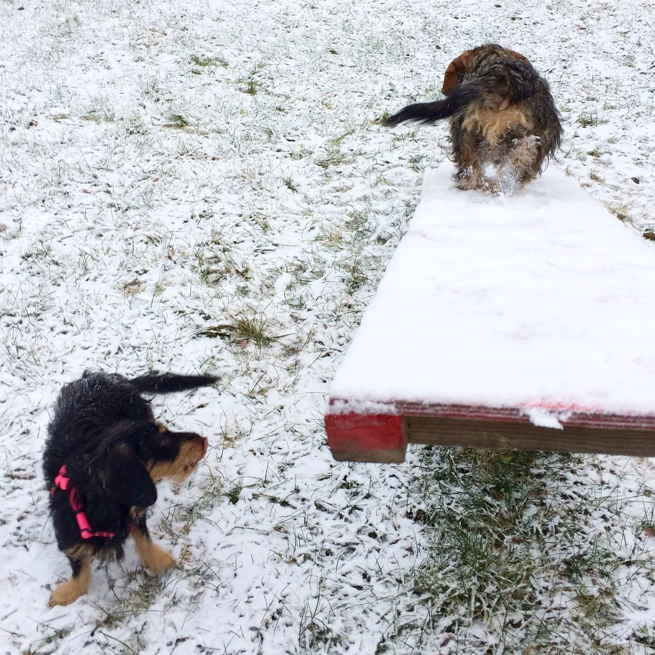 Tänäänkin aurinko pilkotteli. Ihanaa! Tein töitä kotona. Lähdin tyttöjen kanssa ulkoilemaan työpäivän päätteeksi. Lenkiltä menimme taas vähän treenailemaan kivalle koulutuskentälle. Täällä meillä kylilä on sellainen kiva kenttä, jossa me treenaillaan likkojen kaa kiipeilyä, pujotellaan keppien väleissä. Likat tykkää. Kerttu enemmän. On rohkeampi. Hilkkakin tykkää, ja hän saa touhuta tahtiin omaan. Aina niin palkitsen, kun uskaltaa enemmän. Tänään minua nauratti, kun kiikku oli jäätynyt. Se ei keikahtanutkaan Kertun painosta. Hän monta kertaa käveli kiikun päähän, ponnailikin. Respu! Ja minä nauroin! Lopulta hän tuhahti ja oikein tömisteli kiikulta alas peppu kiukusta täristen.