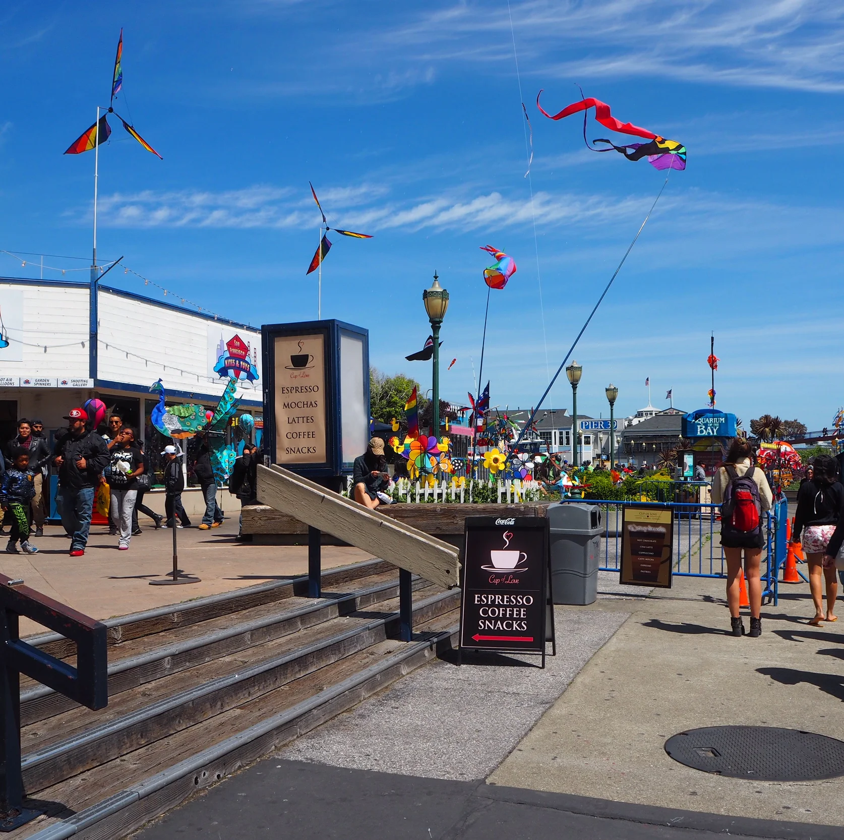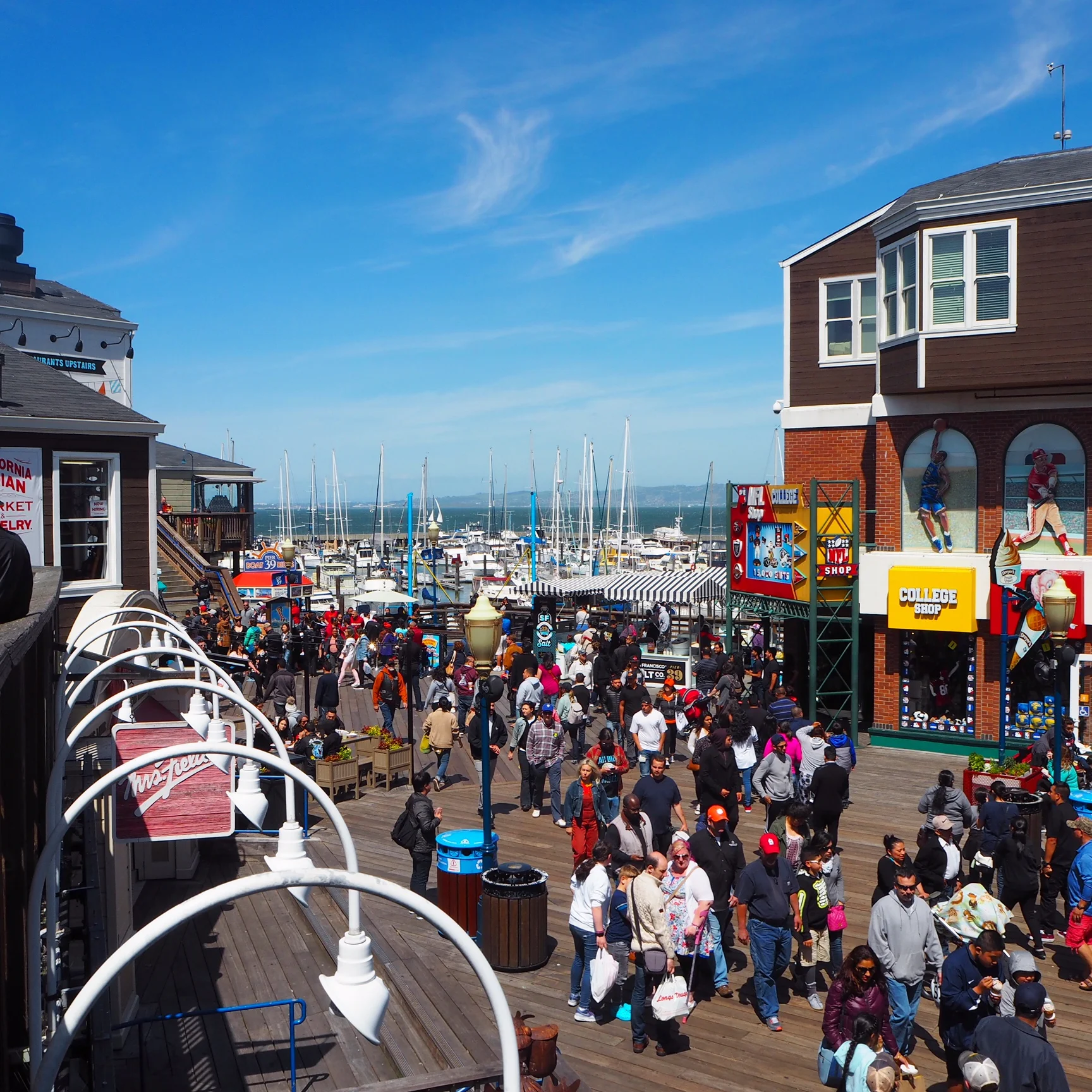 Fisherman`s Wharf on niin veikeä paikka. Se on satama laivoineen, siellä on huviveneitä, kauppoja, ravintoloita, kaikkea. Satamalaiturit on otettu iloittelukäyttöön, ja siinä onnistuttu. Löytyypä sieltä myös merileijonia. Pier 39 on niiden koti. Aikanaan merileijonat tulivat sinne maanjäristyksen jälkeen 1989. Ensin niitä ajateltiin häätää. Sitten hoksattiin, että ne vetävät puoleensa paikallisia asukkaita sekä turisteja. Merileijonille rakennettiin omat laiturit ja jostain selittämättömästä syystä siellä ne elävät. Eivät häiritse laivaliikennettä, mitään muutakaan. Aika jännä juttu. Ne tulivat ja jäivät, eikä sitä ole pystytty selittämään miksi.