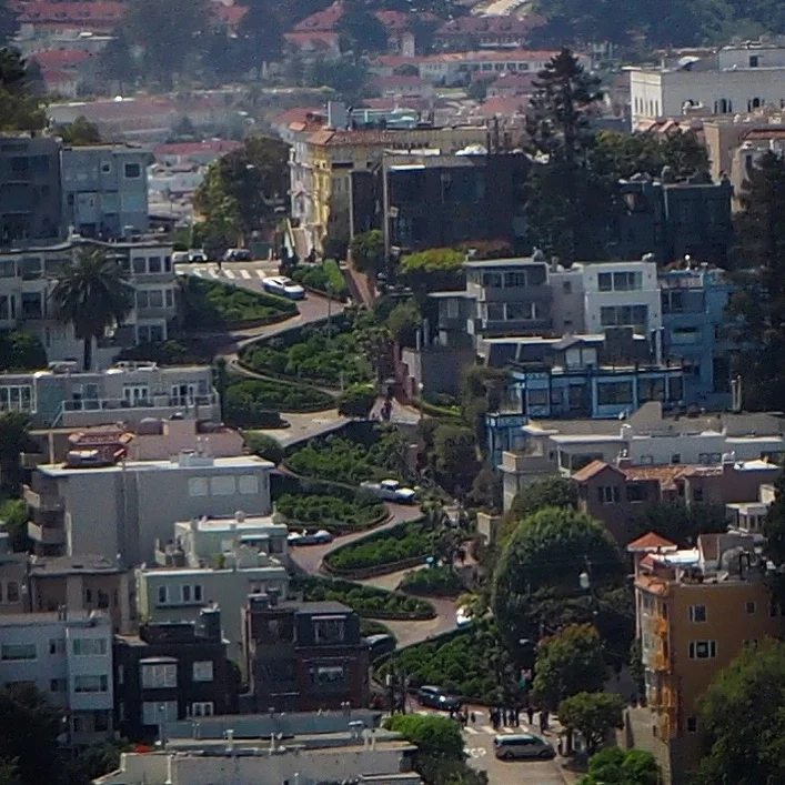 Niinpä huolimatta kuvan huonosta laadusta suurensin yhdestä Coit Towerista ikkunan läpi ottamaani kuvaa. Siitä näkee Lombard Streetin hyvin.