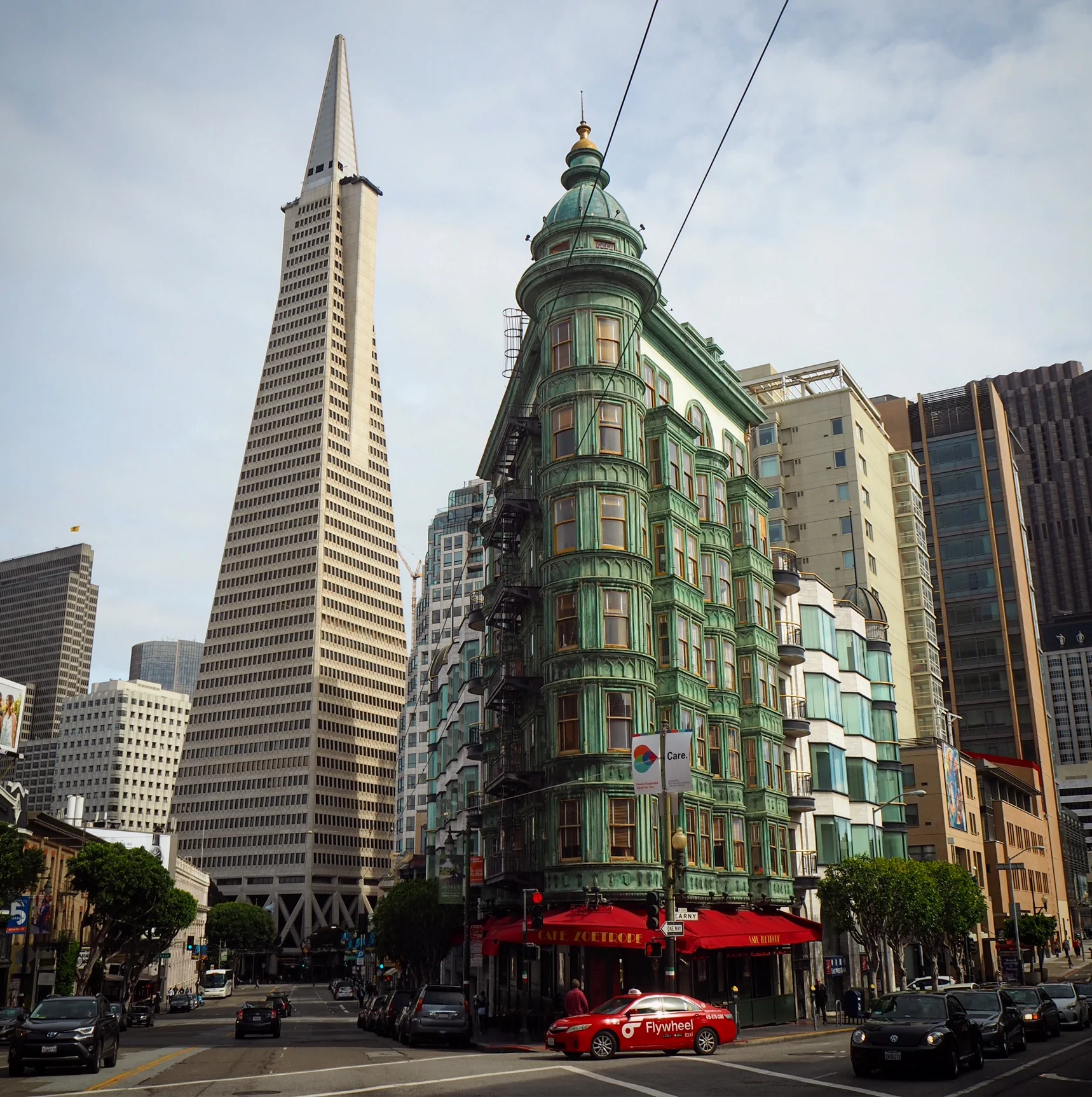 Chinatownin kulman takaa kurkkaili talouselämän keskus Financial District pilvenpiirtäjineen. Tykästyin kovasti silitysrauta-taloon, Columbus Toweriin. Se edustaa samaa tyyliä kuin New Yorkin Flat Iron Building. Talon teräsrunko kesti 1906 olleen maanjäristyksen ja talo valmistui 1907.
