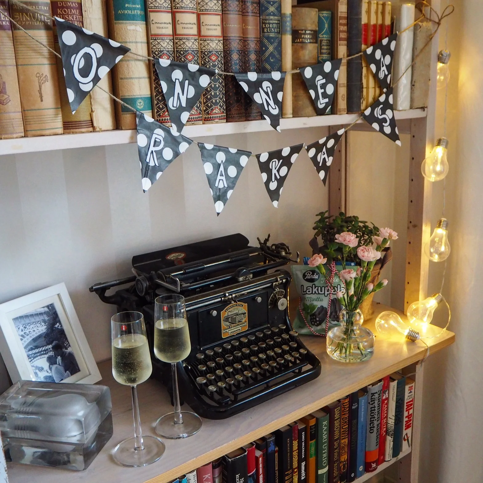 Oikea päivänsä osui viikolle. Ajattelin silti, että juhlistamme. Askartelin itse hienon viirinkin. Ostin synttärilahjaksi lakuja ( likoilta :-D) ja varsinaisen lahjan annoin kirjekuoressa. Herra Ässä saa tilata sellaiset Applen kuulokkeet jotka tahtoo. Laskun saa laittaa hän minulle. Pullistutin myös matkakukkaroa, osana lahja-asioita.
