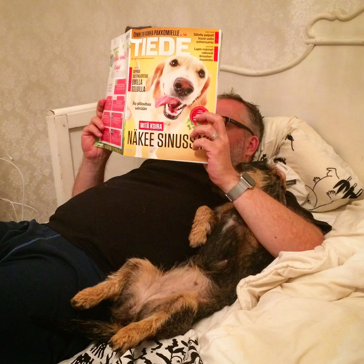 Mäyrinkäistervehdystä tuossa bloksuni loppuun, perinteet kunniaan, jo tulikin. Jatkan aiheella vielä yhden kuvan ja muutaman sanan verran. Nimittäin nauroin ihan ääneen, kun yhtenä iltana tässä iltapesulta makkariin tulin, sänkyyn asettumaan. Herra Ässä luki lehteä, Kainaloisen kanssa.