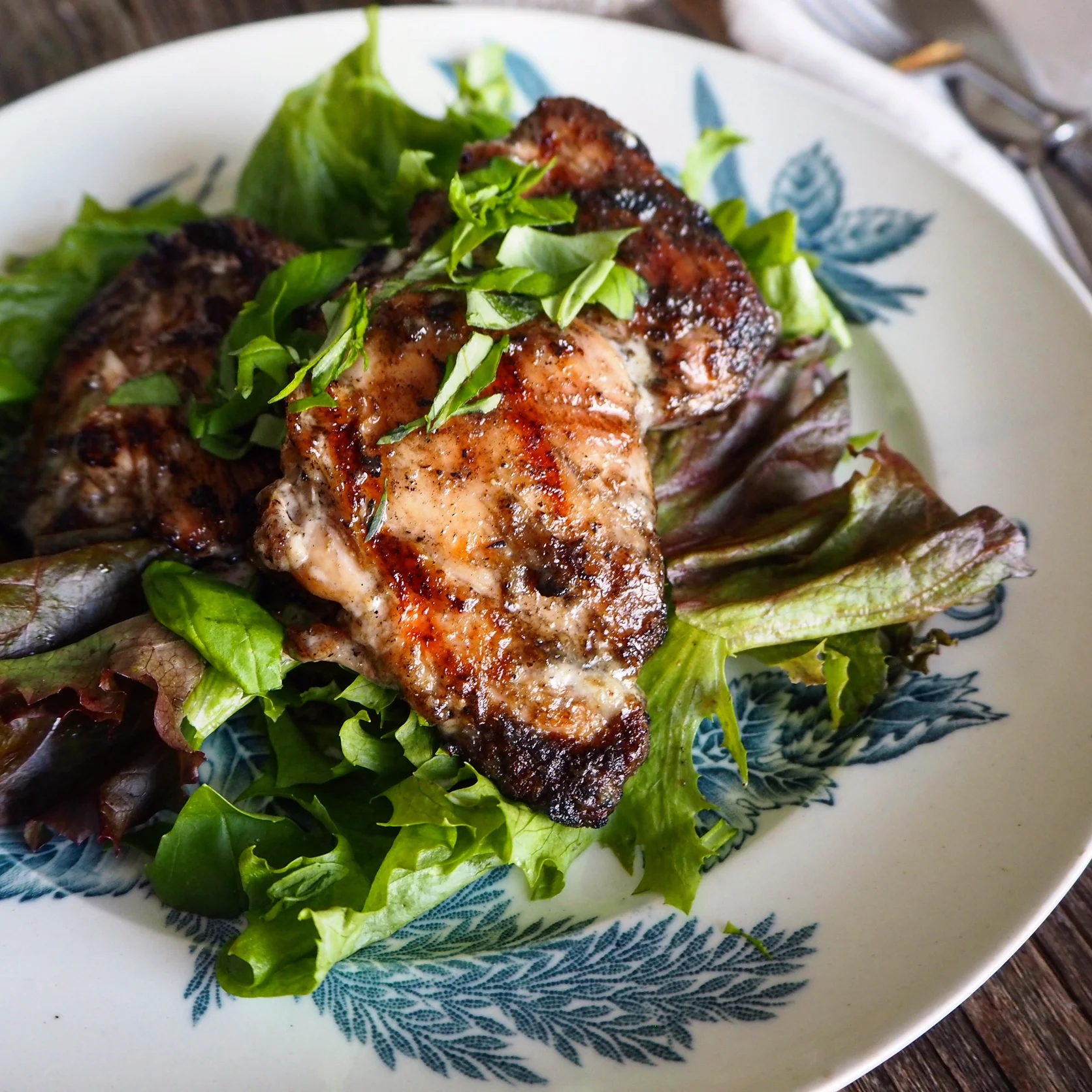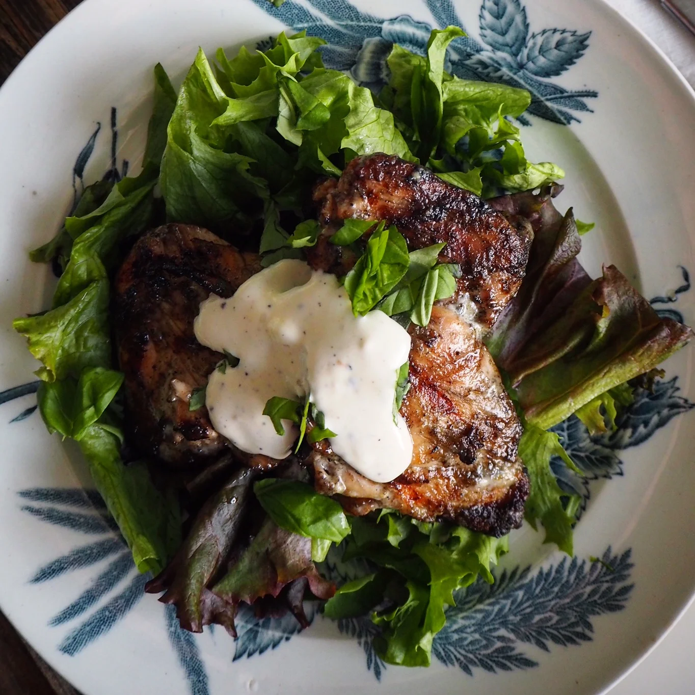 Viime viikonloppuna tarkoituksena oli sitten tietysti tyhjentää jääkaappia; kanan höysteeksi söimme mitä kaapista löytyi. Vihreää salaattia, paprikaa, palsternakkaa sekä porkkanaa. Kolme viimeksi mainittua Herra Ässä grillasi. Voita, öljyä, suolaa. Siinä kasvisten mausteet. Yksinkertaisuus on parasta. Lisäksi halusin että tekemäni kastike pääsee oikein aarioihinsa, eikä mehevän kanan ja raikkaan kastikkeen makusinfoniaa sotketa liikaa muilla makujutskilla.