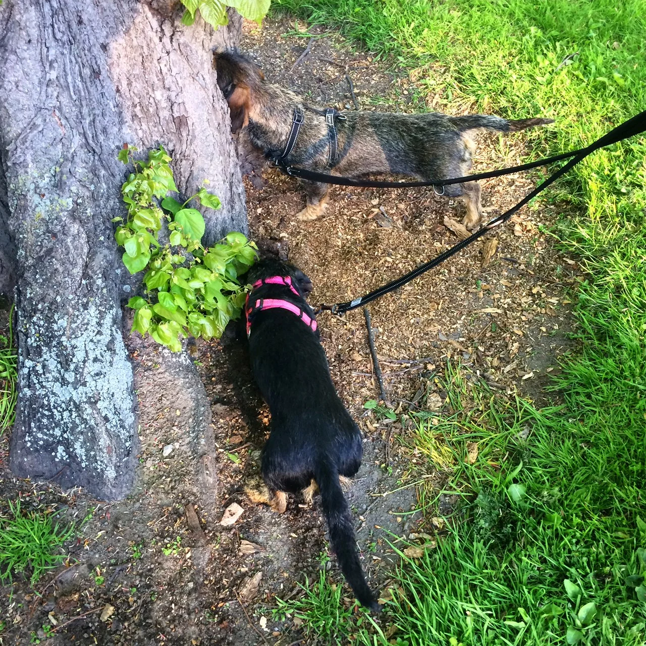 Laitanpa tähän loppuun vielä kuvan tiistai-illalta. Tähtitorninmäellä tehtiin iltalenkki ja mäyräkoirat lempipuuhissaan. Toinen kaivaa monttua ja toinen työntää kuonoaan puussa olevaan koloon.