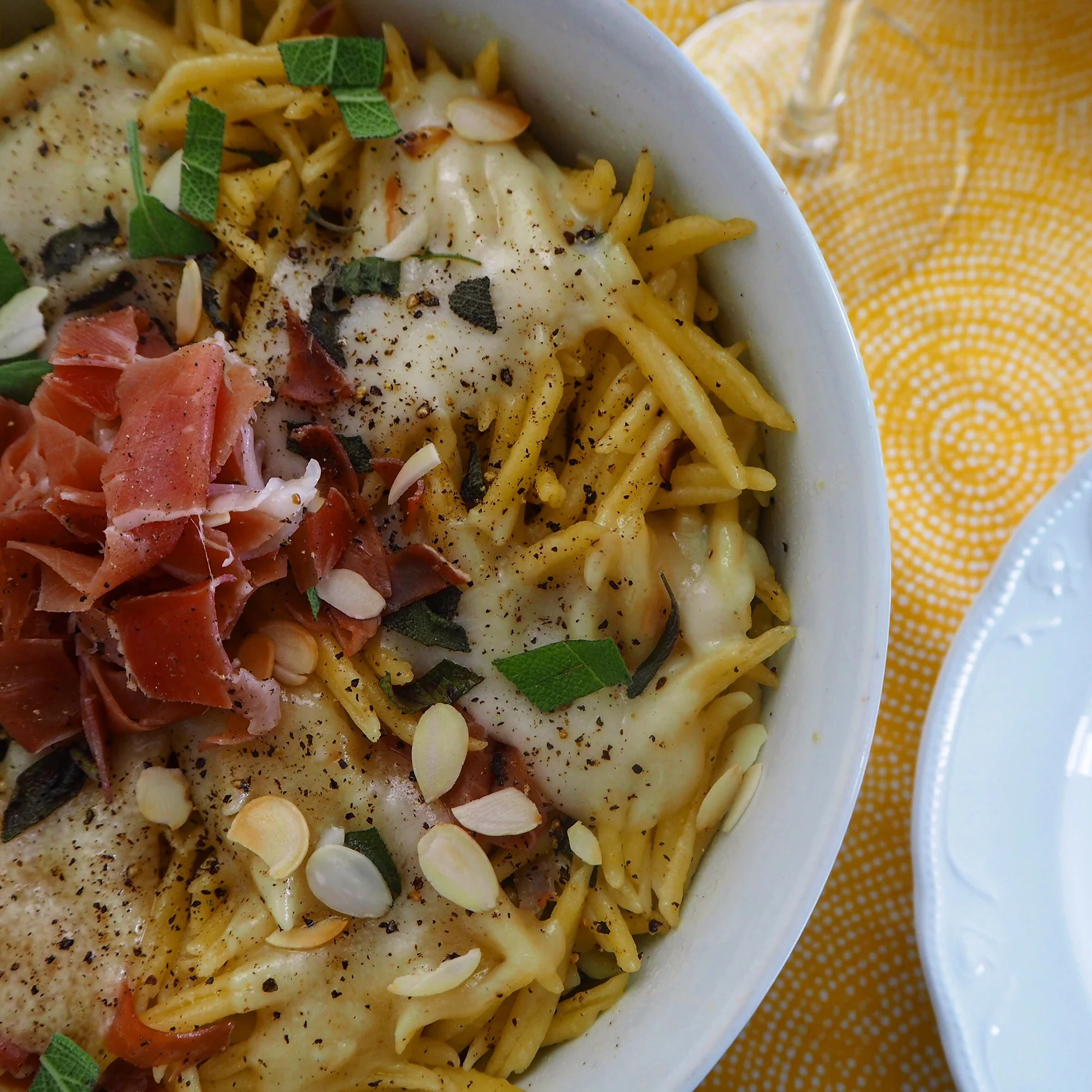 Kun pasta on valmis, laita se uuninkestävään vuokaan. Kaada mantelilastuja ja kastike päälle ja sekoita hyvin pastan joukkoon. Säästä mantelilastuja koristeluunkin.