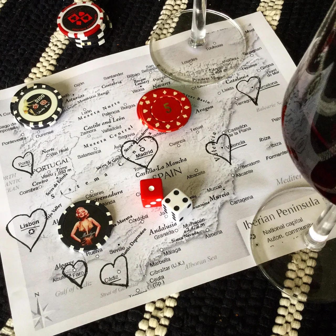 Tässä alla kuva viime viikonlopulta. Teimme karttapelin ja merkkailin sydämin yllämainittuja paikkoja. Las Vegasista ostin antiikki- ja romukaupasta vanhoja kasinon pelimerkkejä. Niilläpä nyt koitimme ratkoa minne mennä. Uhkapeliä!
