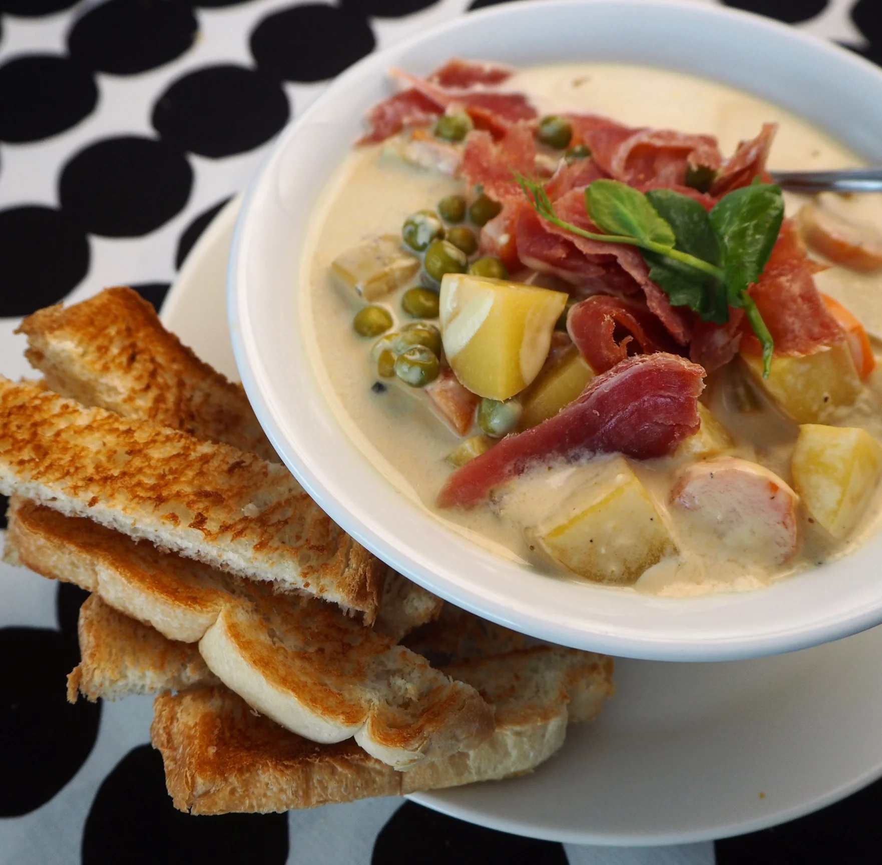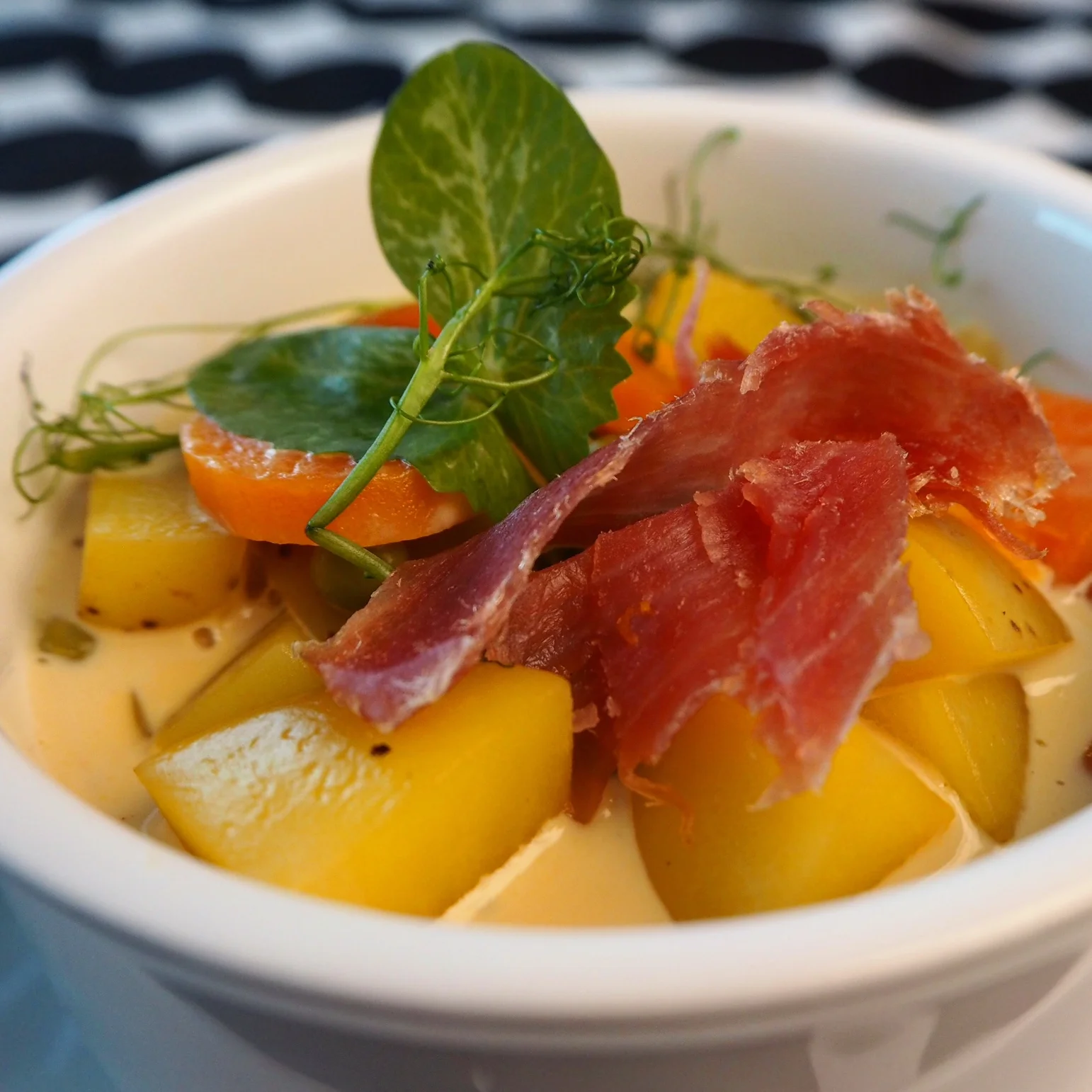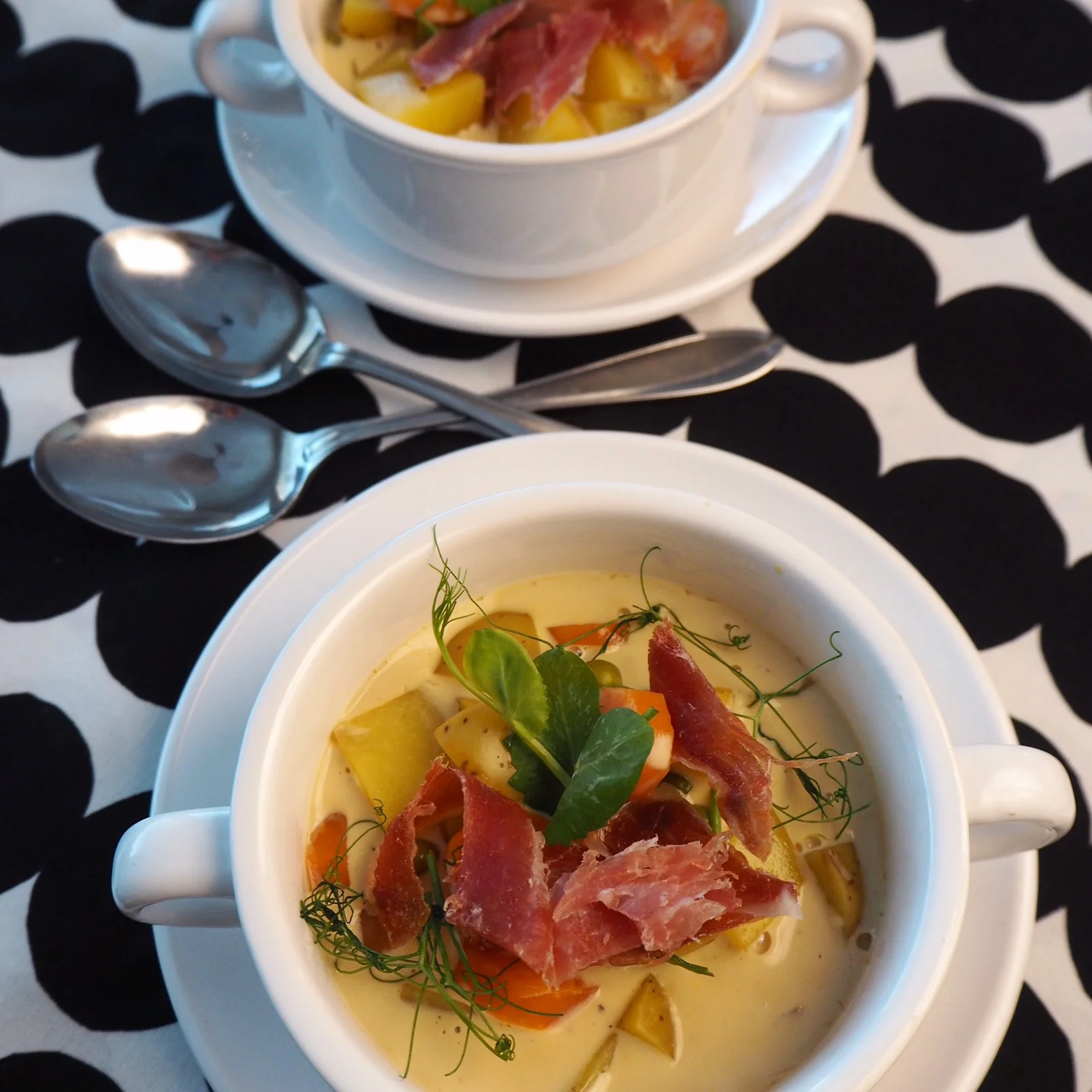 Annostele soppa kupsuihin ja suikaloi päälle kinkkua sekä herneenversoja.